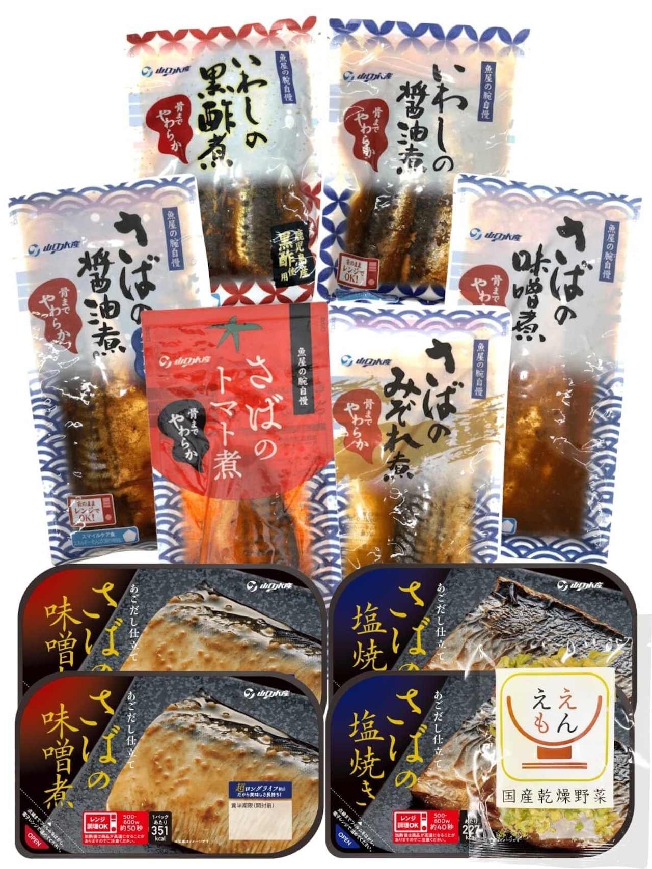 YSフーズ より 骨まで 食べられる あごだし 仕立て 脂がのってふっくら 美味しい サバ イワシ の 煮魚 焼き魚 が入った レトルト 魚 惣菜セット 。 ええもん広場 オリジナル 国産 乾燥野菜 付き