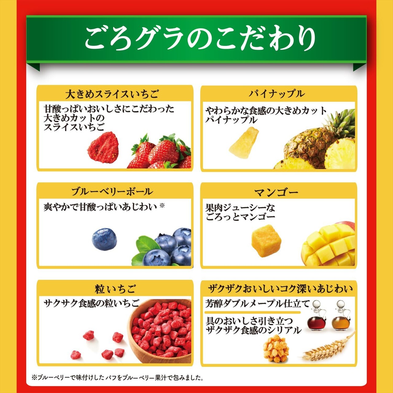 オーツ麦フレーク(オーストラリア製造又はイギリス製造又はその他)、小麦シリアルパフ(大豆を含む)、ライ麦シリアルパフ(コーングリッツ、ライ麦粉、小麦粉、その他)、砂糖、植物油脂、水溶性食物繊維、乾燥パイナップル加工品、デキストリン、乾燥いちご加工品、乾燥マンゴー加工品、ブルーベリーパフ加工品(砂糖、小麦粉、コーングリッツ、食塩、ブルーベリー果汁パウダー)、乳糖、メープルシロップ/グリセリン、炭酸カルシウム、加工でん粉、ビタミンC、乳化剤、着色料(ウコン、クチナシ、アントシアニン、パプリカ色素)、酸味料、香料、酸化防止剤(ビタミンE、ビタミンC、ローズマリー抽出物)、ピロリン酸鉄、増粘剤(アラビアガム)、カゼインNa、光沢剤、ナイアシン、パントテン酸カルシウム、ビタミンB6、ビタミンB1、ビタミンB2、葉酸、ビタミンD、ビタミンB12