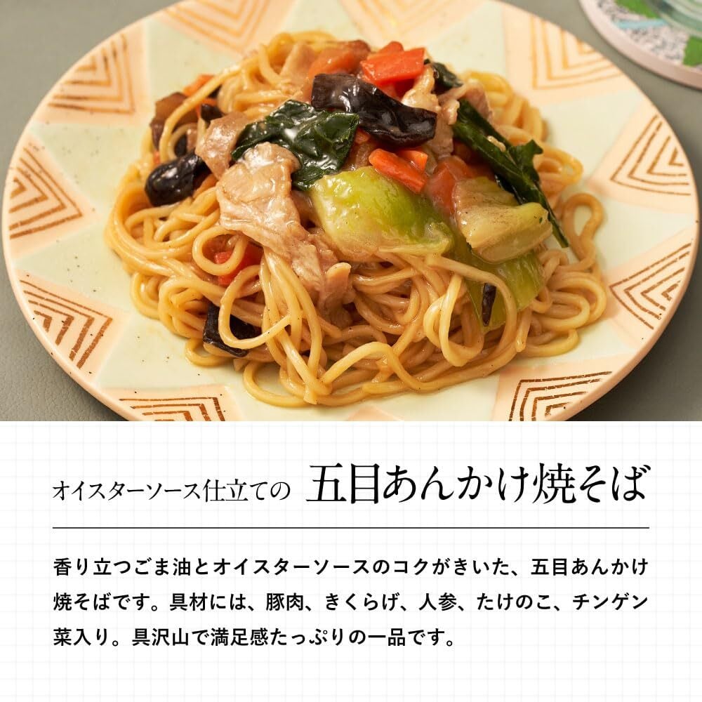 香り立つごま油とオイスターソースのコクがきいた、五目あんかけ焼そば。豚肉、きくらげ、人参、たけのこ、チンゲン菜入り。