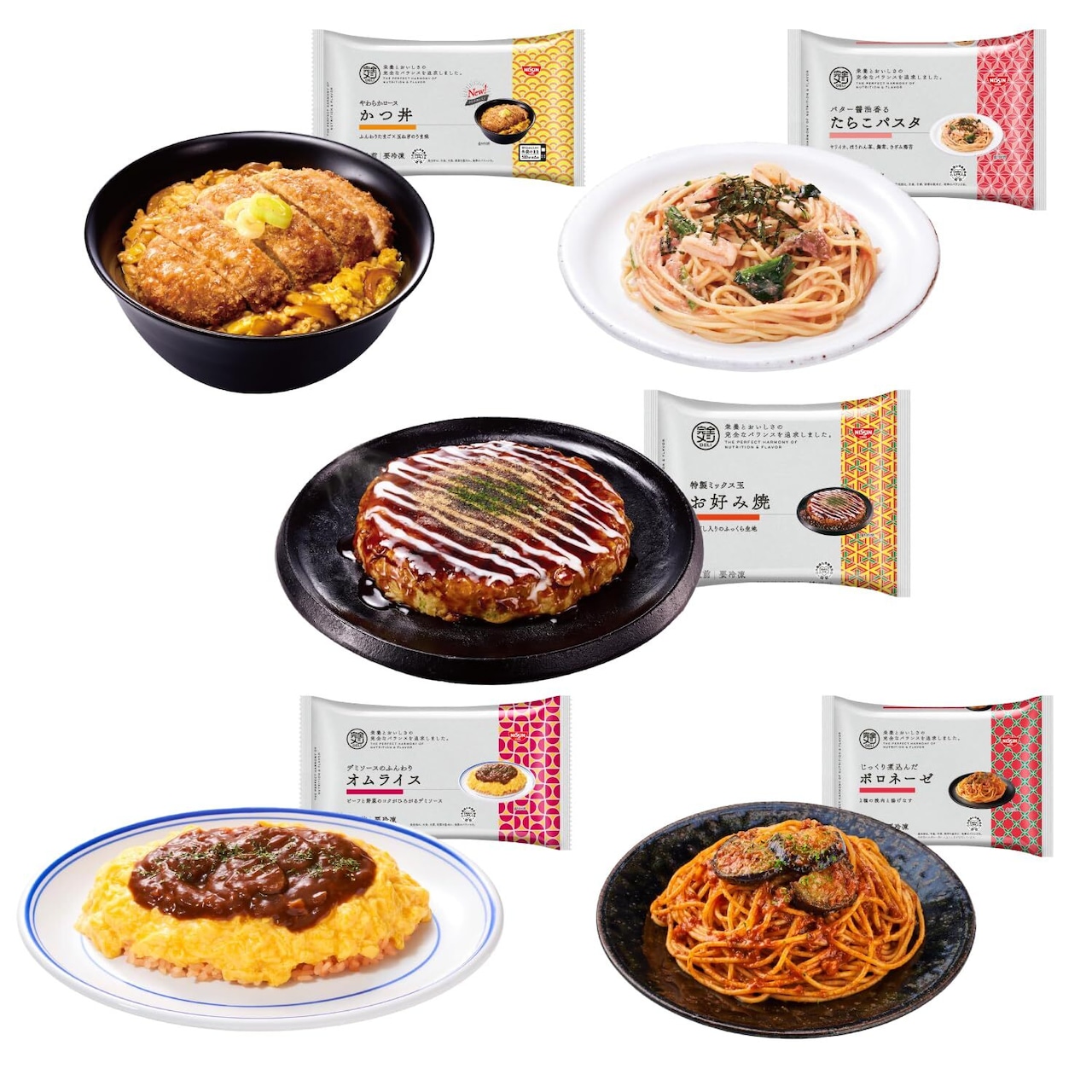 冷凍完全メシ人気のメニュー「かつ丼」「たらこパスタ」「ボロネーゼ」「デミオムライス」「お好み焼 特製ミックス玉」の5種類のメニューを1食ずつ 計5食お届け!