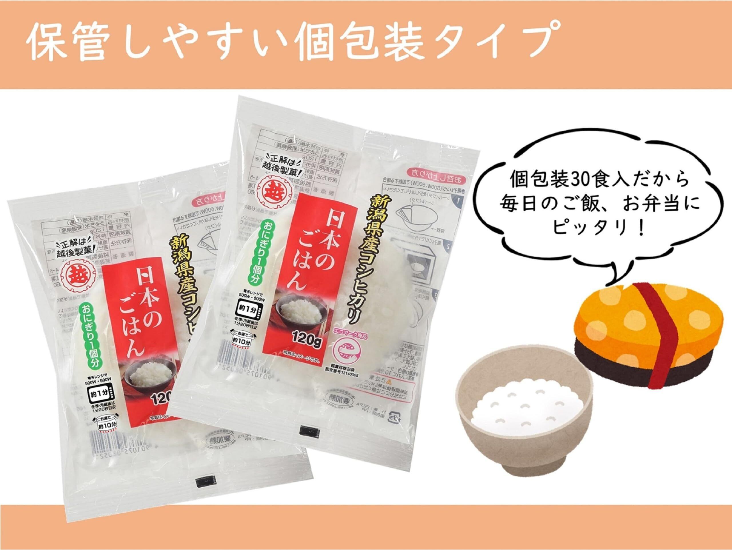 毎日の食卓にピッタリの120g、30食入り個包装タイプの日本のごはんです。 1食ずつ個包装になっているので毎日のごはんやお弁当にもぴったりです。また、ケースから1食ずつ取り出しやすい仕様で、段ボールのままストックしていただくことができます。 ◇新潟県産コシヒカリ100%使用 ◇レンジで1分間チンするだけで、炊きたての味。毎日の食卓でおいしくお召し上がりいただけます。 ◇従来のトレー容器と比べ、プラスチック資材を5分の1に削減し、環境に配慮した商品です。(当社従来品比)