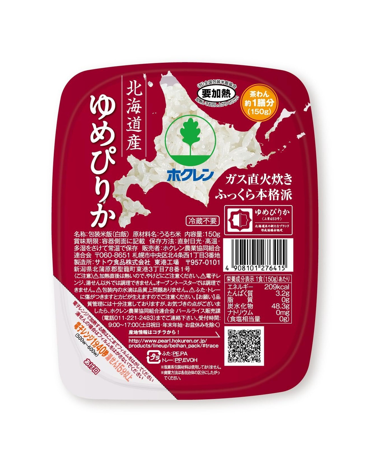 ・精米「ホクレンゆめぴりか」と同じ厳しい基準をクリアした原料を使用しております。1食分にちょうど良い150g入りのパックご飯です。