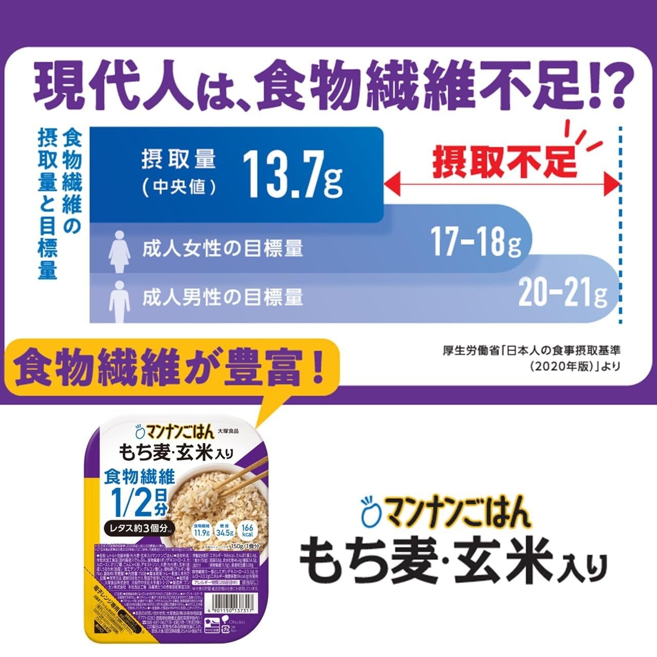 1食で1/2日分の食物繊維 (レタス約3個分)がとれるもち麦と玄米とマンナンヒカリが入ったパックごはん。カロリー・糖質も白米のごはんに比べて糖質・カロリー25%カット。