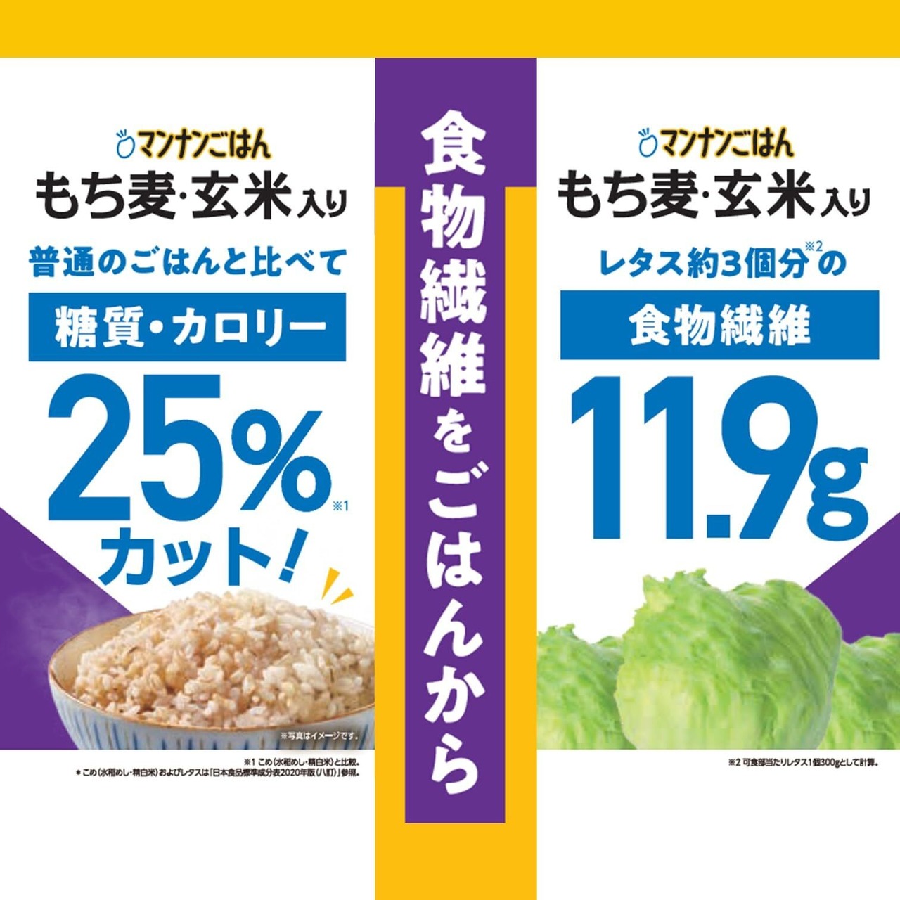 1食で1/2日分の食物繊維 ※1(レタス約3個分※2)がとれるもち麦と玄米とマンナンヒカリが入ったパックごはん。カロリー・糖質も白米のごはんに比べて糖質・カロリー25%カット。