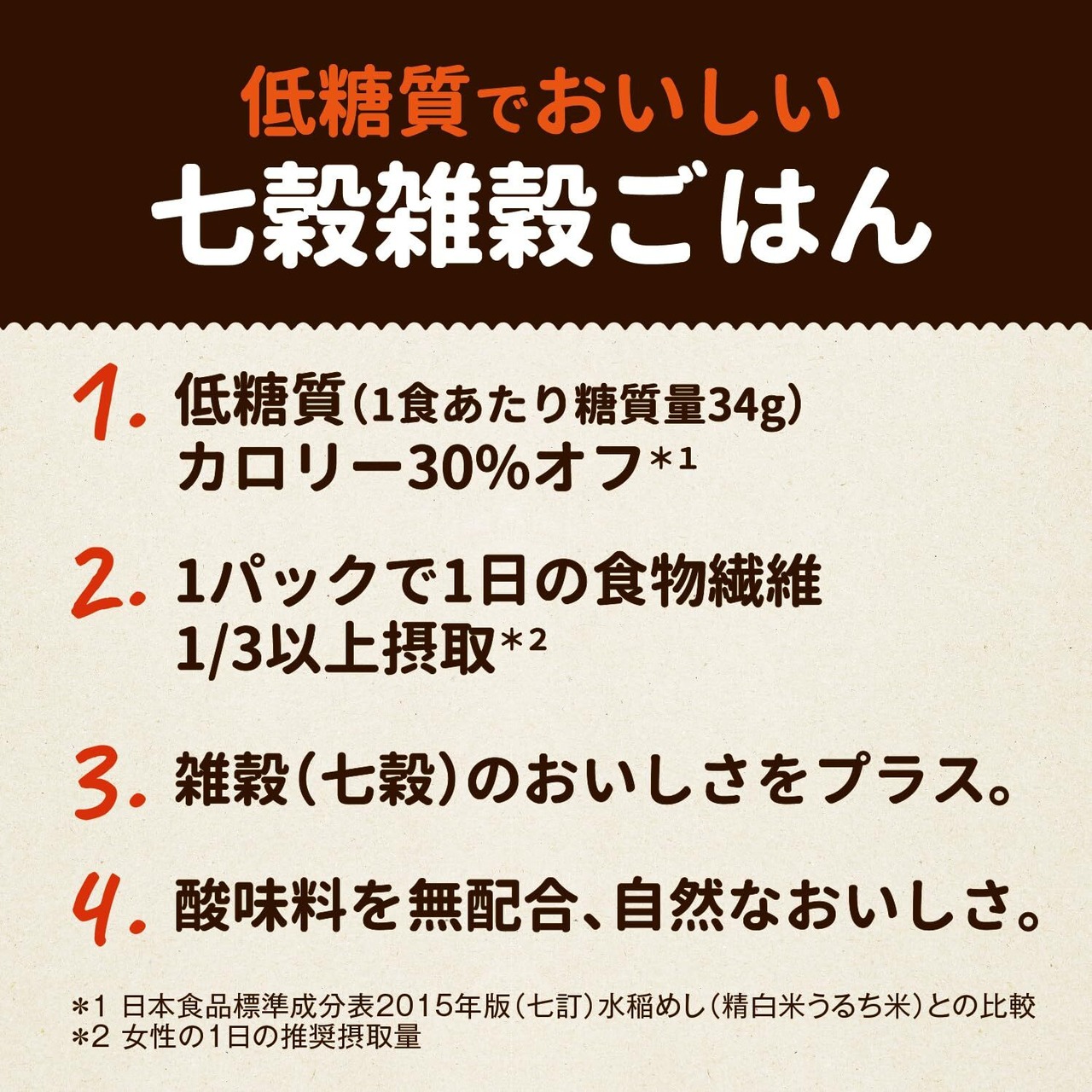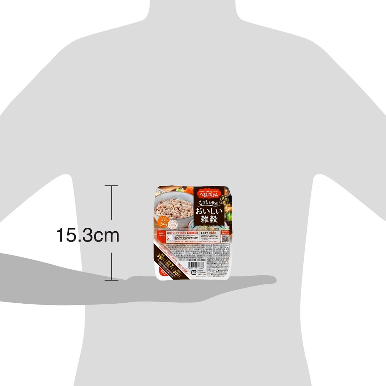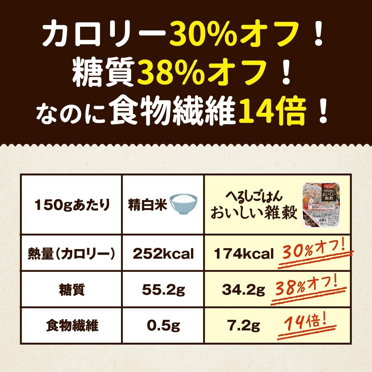 毎日続けて、糖質コントロール。精白米と比べて、カロリー30%オフ!糖質38%オフ!なのに食物繊維16倍!1食で女性の1日の1/3の食物繊維量が摂れます。ロカボ”でおいしく楽しく適正糖質。「へるしごはん おいしい雑穀」は味にも、とことんこだわりました。精白米と置き換えるだけで、簡単にカロリー&糖質コントロールが出来ます。雑穀(七穀)のおいしさをプラス。こんにゃく米は使わず、白米と雑穀のみを組み合わせました。もちもち食感の「もち麦」とプチプチ食感の「丸麦」を加え、食感も楽しんでいただけます。電子レンジやお湯でパパッと!簡単調理。食べたいときにすぐ出来る!便利なパックごはん。日々のお食事やお弁当にもおススメです。