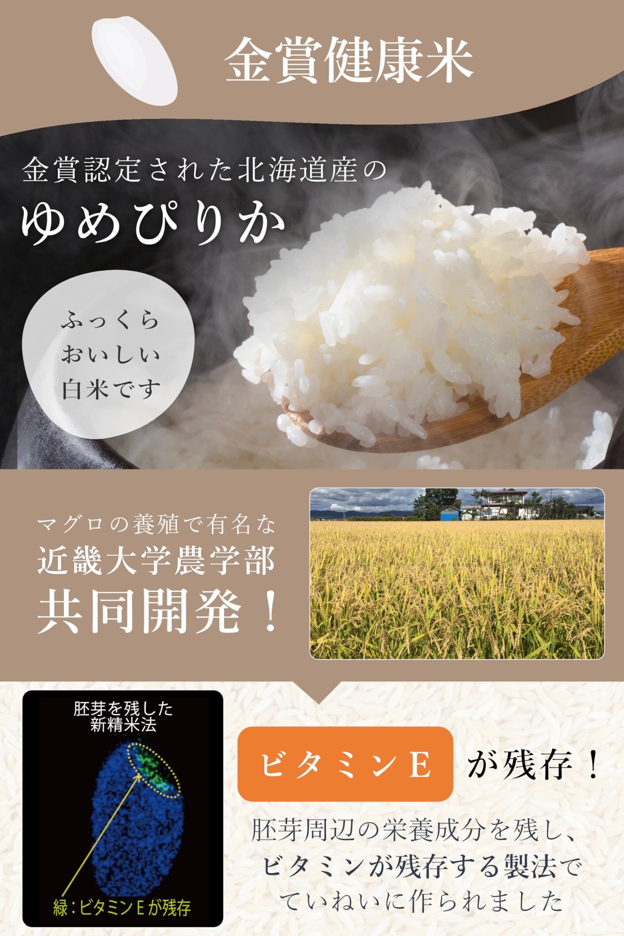 【金賞健康米とは】 金賞健康米は、北海道産の高級銘柄「ゆめぴりか」を五つ星お米マイスターが厳選。 独自の「ヘルスキープ製法」により、通常の精米方法では失われがちなビタミンEやビタミンB1を多く残しています。 日本米飯管理士協会から金賞を受賞した、ふっくらとした美味しさと栄養バランスを兼ね備えた国産白米です。