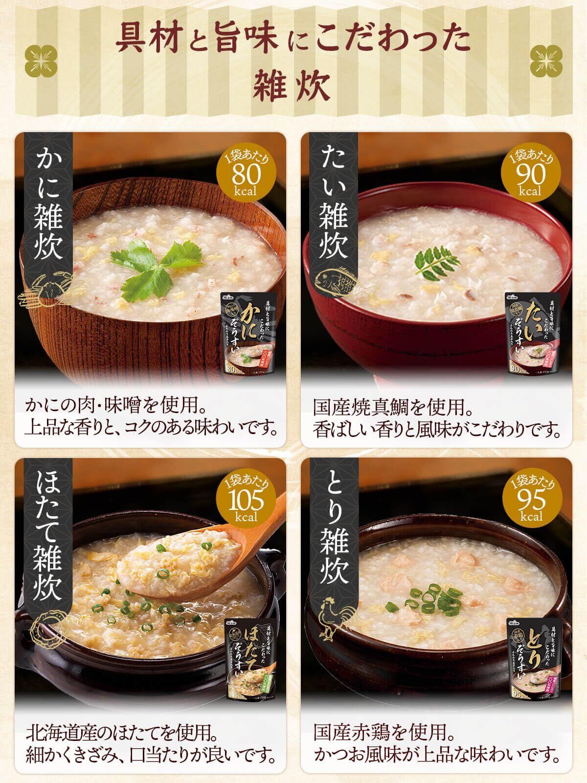 和風 鶏塩粥 かつお醤油粥 スープ にこだわった 中華風粥 参鶏湯風粥 国産 焼真鯛 赤鶏 北海道産 ほたて かに の身 雑炊 。 忙しい時 や あまり 食欲 が わかない 時 、 朝食 ランチ 夜食 にも おすすめ 。