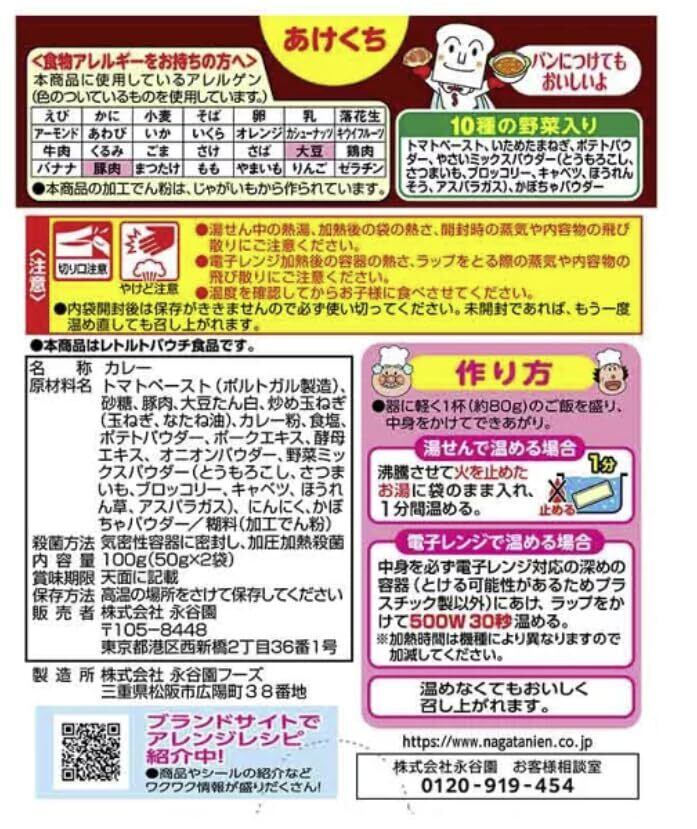 炒め玉ねぎ(玉ねぎ、なたね油)(国内製造)、野菜(人参、じゃがいも)、砂糖、豚肉、トマトペースト、カレー粉、ポテトパウダー、食塩、ポークエキス、酵母エキス、野菜ミックスパウダー(とうもろこし、さつまいも、ブロッコリー、キャベツ、ほうれん草、アスパラガス)、にんにく、オニオンパウダー/糊料(加工でん粉)