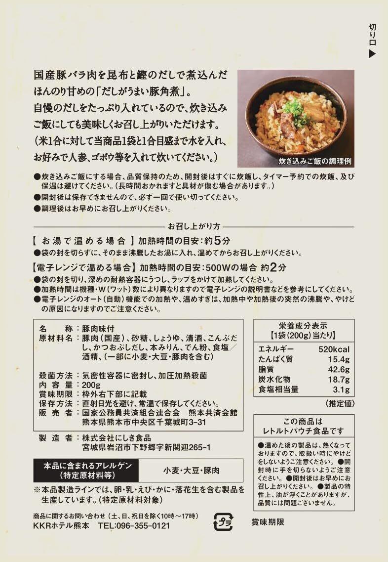 KKRホテル熊本 レトルトシリーズ第二弾!! だしがうまい!豚角煮6個セット 200g×6個 国内製造 常温保存 国産豚バラ肉 昆布と鰹のだしで煮込んだほんのり甘め レトルト食品 お湯 電子レンジ ギフト 火の国サラマンダーズ スタジアムグルメ 炊き込みご飯