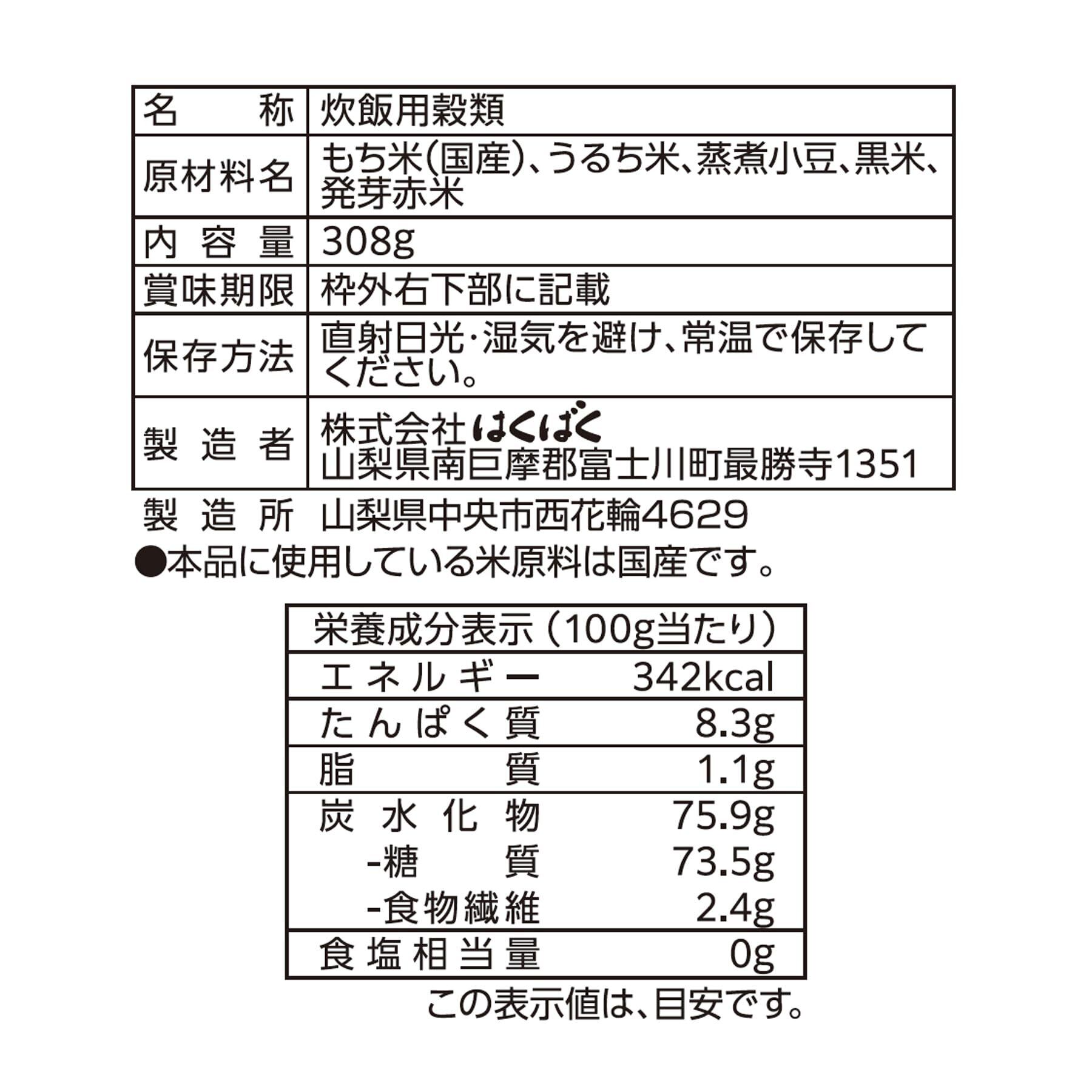 原材料:もち米(国産)、うるち米、蒸煮小豆、黒米、発芽赤米