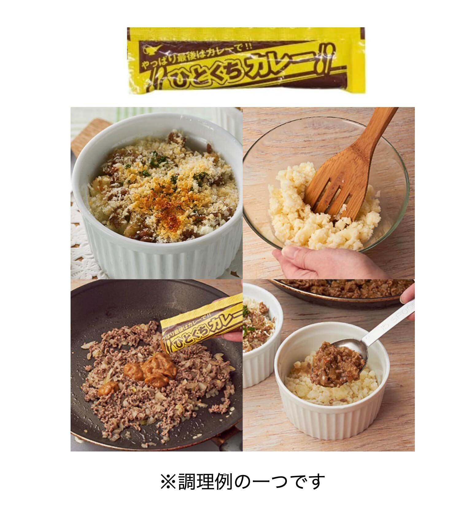 ■ひとくちカレー カレールウ(国内製造)、野菜(じゃがいも、玉葱、人参、生姜)、食肉(牛肉、豚肉)、水飴、マンゴーチャツネ、植物油脂、デーツピューレ、トマトケチャップ、パイン果汁、ウスターソース、カレー粉、食塩、おろしにんにく加工品、ビーフ調味エキス、レモン果汁、香辛料/増粘剤(加工澱粉)、調味料(アミノ酸等)、着色料(カラメル)、酸味料、香辛料抽出物、(一部に小麦・乳成分・牛肉・大豆・バナナ・豚肉・りんごを含む)