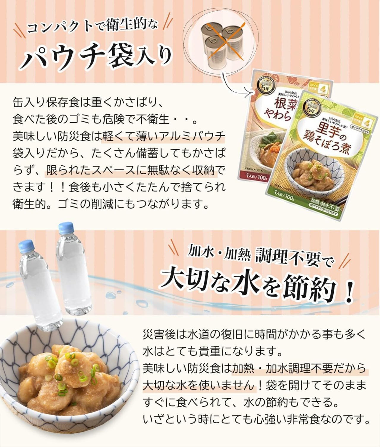 全ての商品がアルミを破ってすぐに食べられます。どうしてもお湯が用意できないとき、冷たいままでも美味しく食べられます。また、レトルト食品と違い、独特のにおいなどもありません。