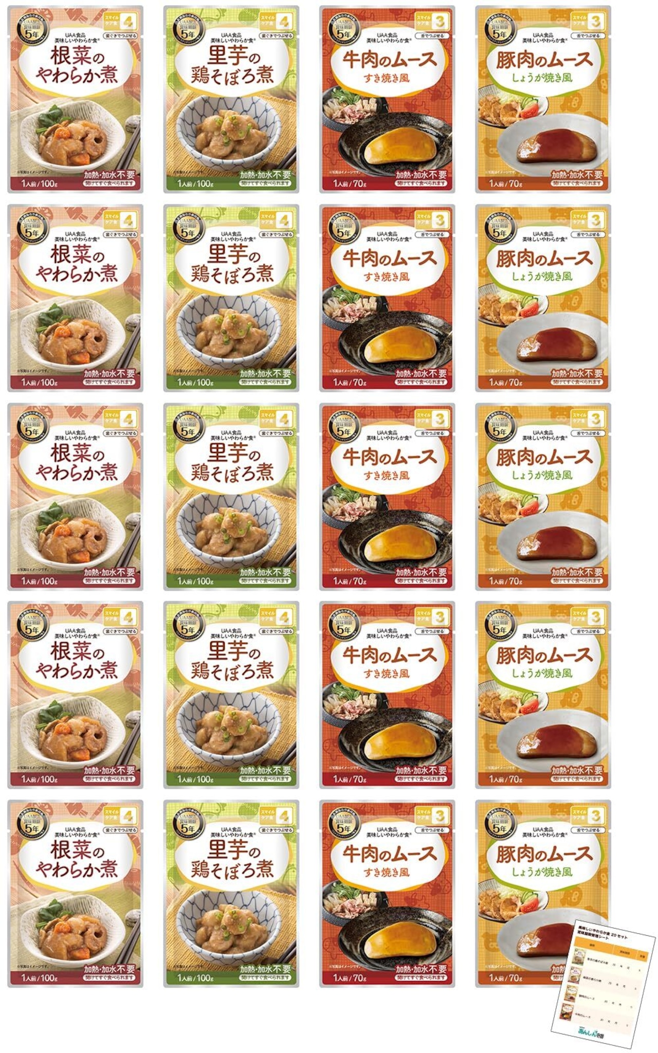 高齢者向け 非常食セット おかず 5年保存 美味しいやらわか食 防災食 長期保存食 備蓄食料 保存食 非常用食料 災害 そのまま食べられる 水不要 レトルト 老人ホーム 施設 4種類×各5セット 賞味期限管理シート付 あんしん壱番