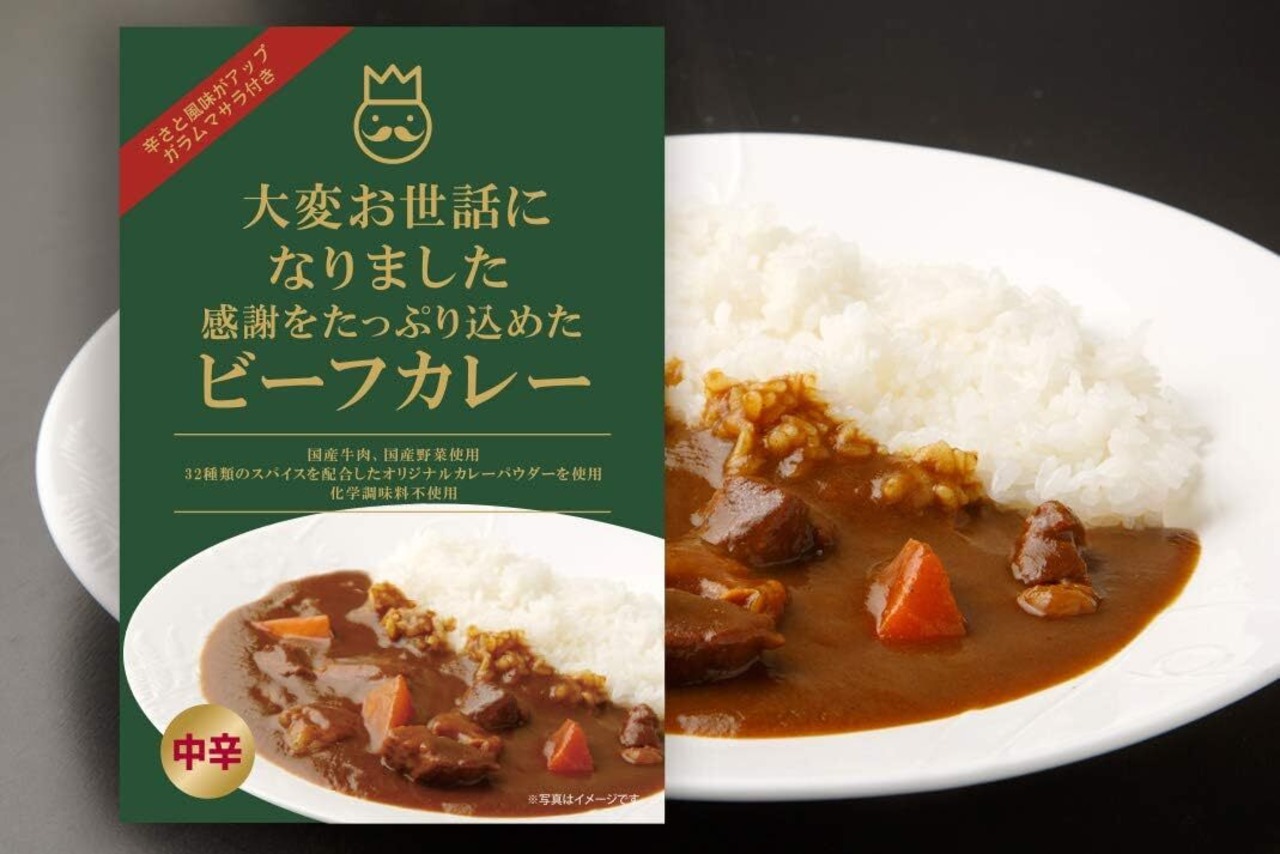 「大変お世話になりました」のメッセージが入ったパッケージのビーフカレー。価格は1人前(190g)×6個のお値段です。