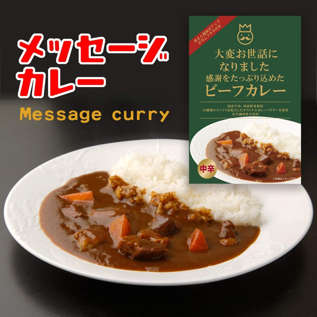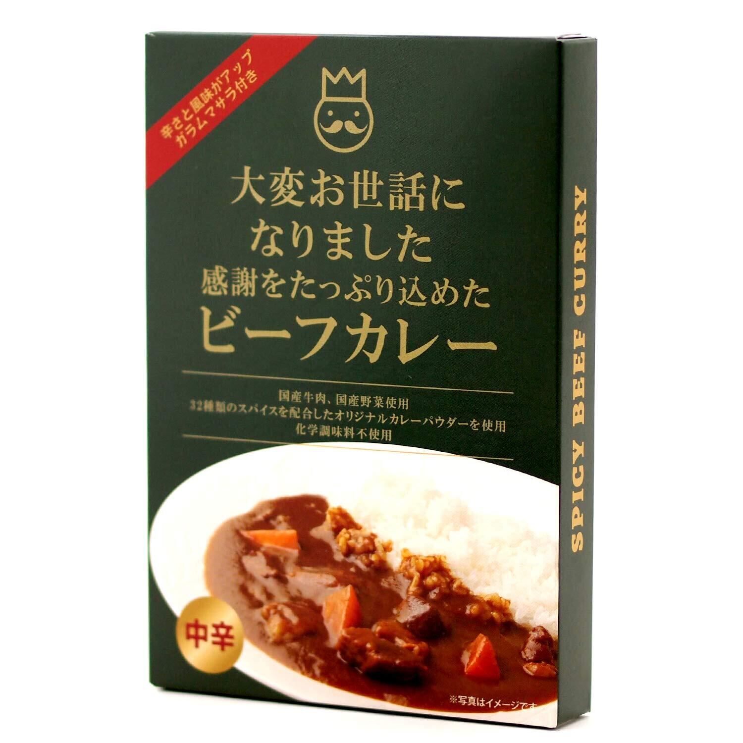 【ビーフカレー】「大変お世話になりました」のメッセージが入ったパッケージになっています。価格は1人前(190g)×6個のお値段です。