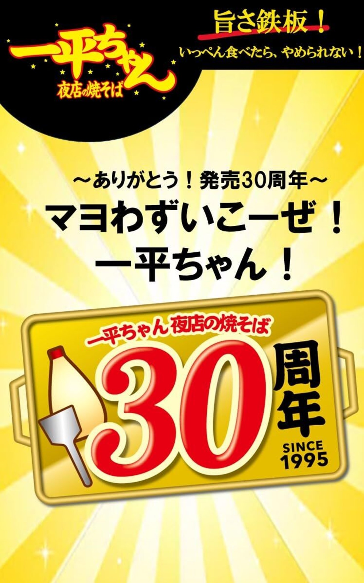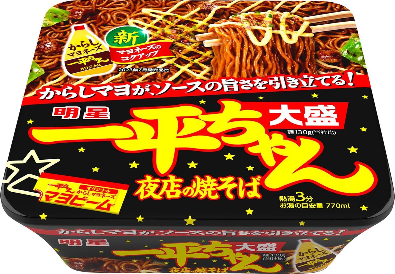 旨さ鉄板!いっぺん食べたら、やめられない!「一平ちゃん夜店の焼そば 大盛」。マヨネーズのコクがアップした、一平ちゃんオリジナルからしマヨネーズがソースの旨さを引き立てる! 最大の特徴である「からしマヨネーズ」を強化して、最高にうまい一平ちゃんへ進化します!