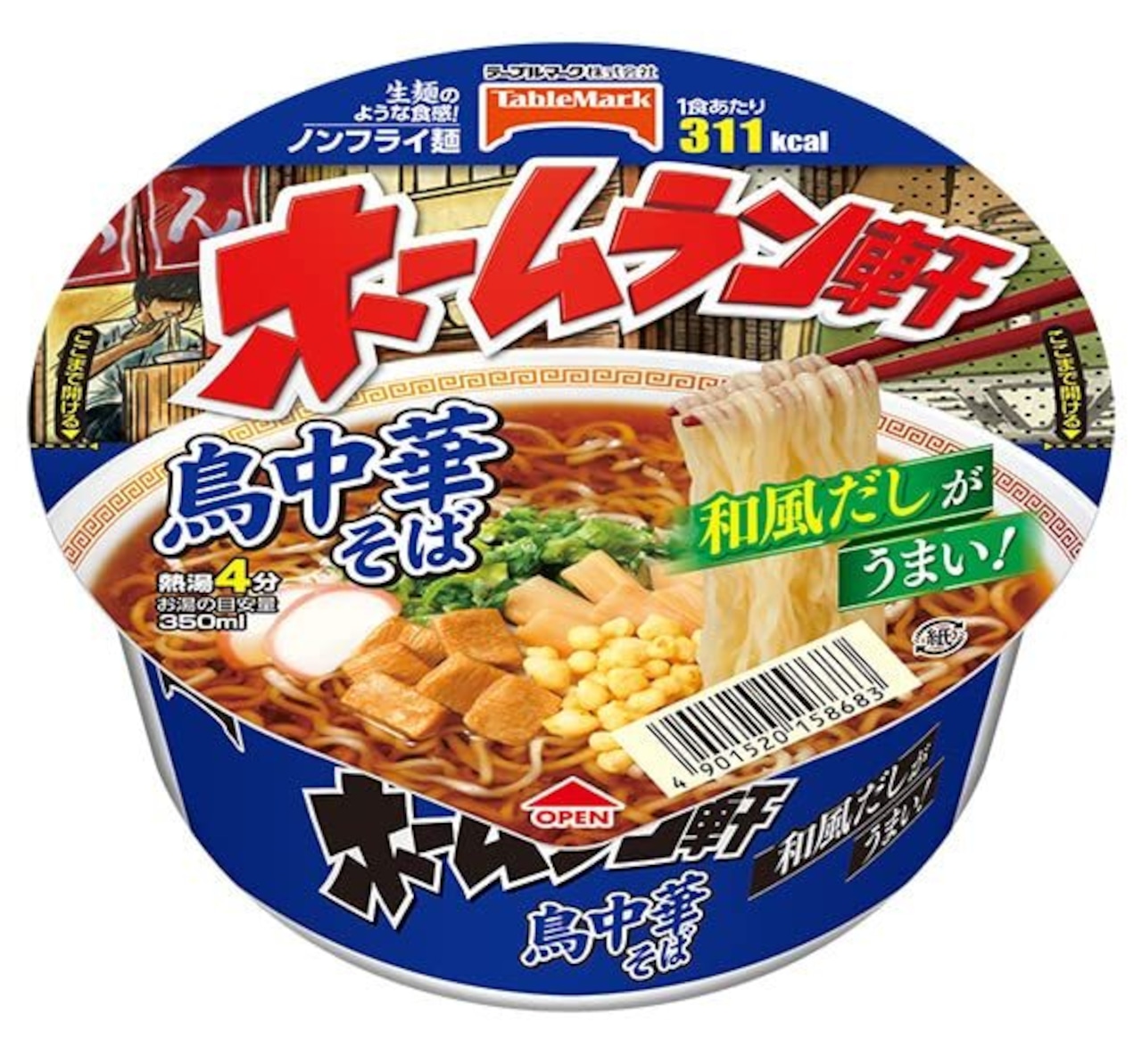 山形県天童市のそば店で有名なメニューを参考に、ホームラン軒ブランドで商品化しました。麺はもちもち食感のノンフライ麺を使用。具材は味付鶏肉・メンマ・揚げ玉・かまぼこ・ねぎ入り。スープはかつおやこんぶエキスを使用した甘めのそばつゆだしがベース。鶏の風味が香る醤油味のラーメンです。