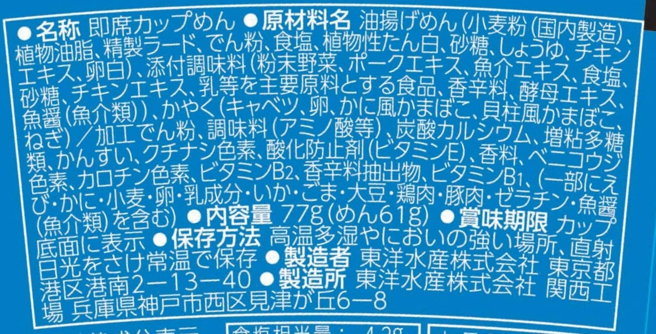 かやくは、かに風かまぼこ、たまご、貝柱風かまぼこ、キャベツ、ねぎ。