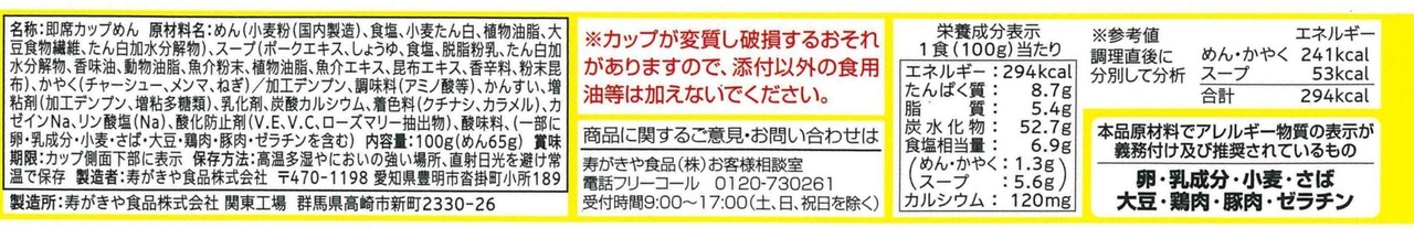 めん(小麦粉(国内製造)、食塩、小麦たん白、植物油脂、大豆食物繊維、たん白加水分解物)、スープ(ポークエキス、しょうゆ、食塩、脱脂粉乳、たん白加水分解物、香味油、動物油脂、魚介粉末、植物油脂、魚介エキス、昆布エキス、香辛料、粉末昆布)、かやく(チャーシュー、メンマ、ねぎ)/加工デンプン、調味料(アミノ酸等)、かんすい、増粘剤(加工デンプン、増粘多糖類)、乳化剤、炭酸カルシウム、着色料(クチナシ、カラメル)、カゼインNa、リン酸塩(Na)、酸化防止剤(V.E、V.C、ローズマリー抽出物)、酸味料、(一部に卵・乳成分・小麦・さば・大豆・鶏肉・豚肉・ゼラチンを含む)