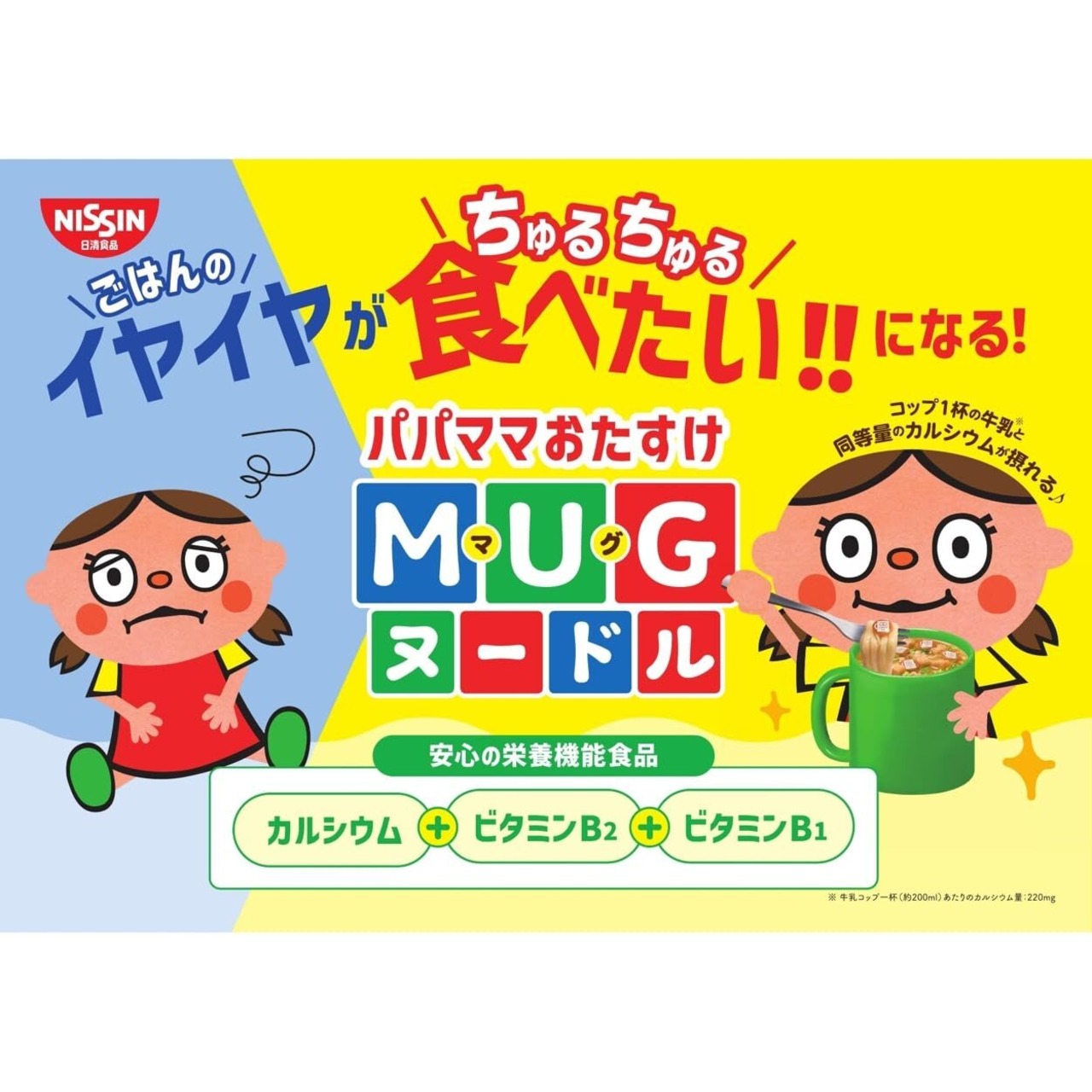 おやつやスープの代わりに! おやつやスープ代わりにぴったり!ミスターマグのかわいいなるとが入ったマグカップで食べるミニヌードル。コンソメしょうゆ味、シーフード味の2種入り。カルシウム・ビタミンB1・B2を強化した栄養機能食品。