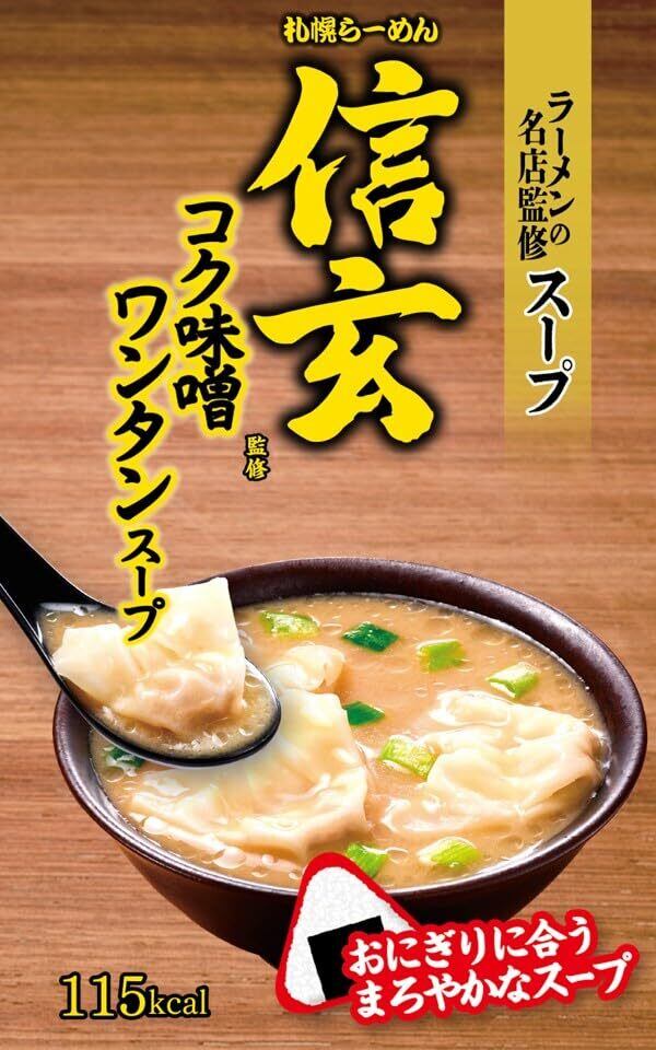 ●北海道でしか食べれない人気店「らーめん信玄」監修のカップスープ。スープ:ポークエキスに、白味噌を加えたまろやかな粉末スープと、ボークベースに白味噌・ローストした玉ねぎ味噌ペーストにもやしやガーリックの香りをつけた液体オイルを合わせた液体スープのダブル味噌スープで再現しました。1食飲み干せる味わいでらーめん信玄のコク味噌を再現。おにぎりとの食べ合わせが抜群!●<「らーめん信玄」について>看板メニュー「信州・コク味噌」は、まろやかで甘くコクのある味噌スープが特徴です。南6条店は、繁華街「すすきの」近くにあり、昼は「観光客」、夜は「地元民(飲んだ後の〆利用)」に愛されています。