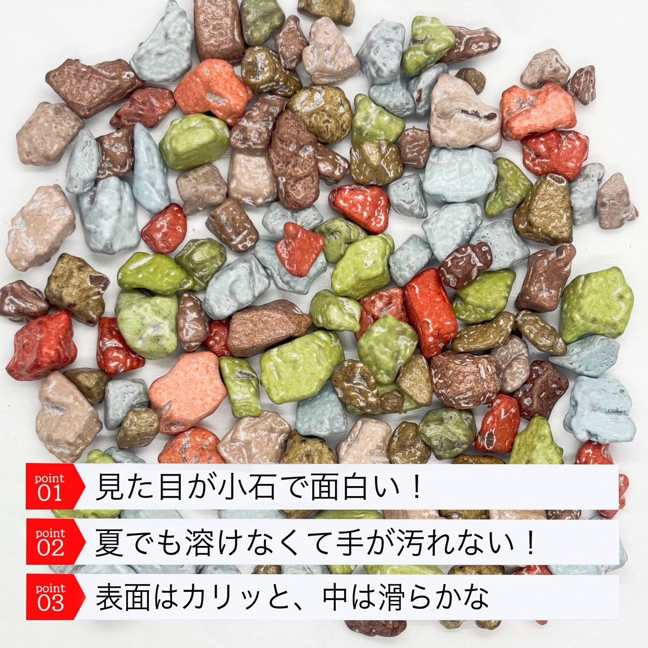 【特徴】 小石そっくりの見た目:色と形のリアルさに驚き!ユニークで会話のきっかけにも◎ 優しい甘さ:ほどよい甘さで、クセになる味わい カリッと食感&手が汚れにくい:外は糖衣、中はなめらかなチョコ。コーティングで手もベタつきません 夏でも溶けにくい仕様:暑い季節でも溶けず、年間通して美味しく楽しめる。手が汚れず扱いやすい。