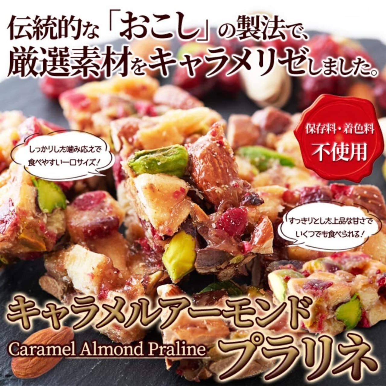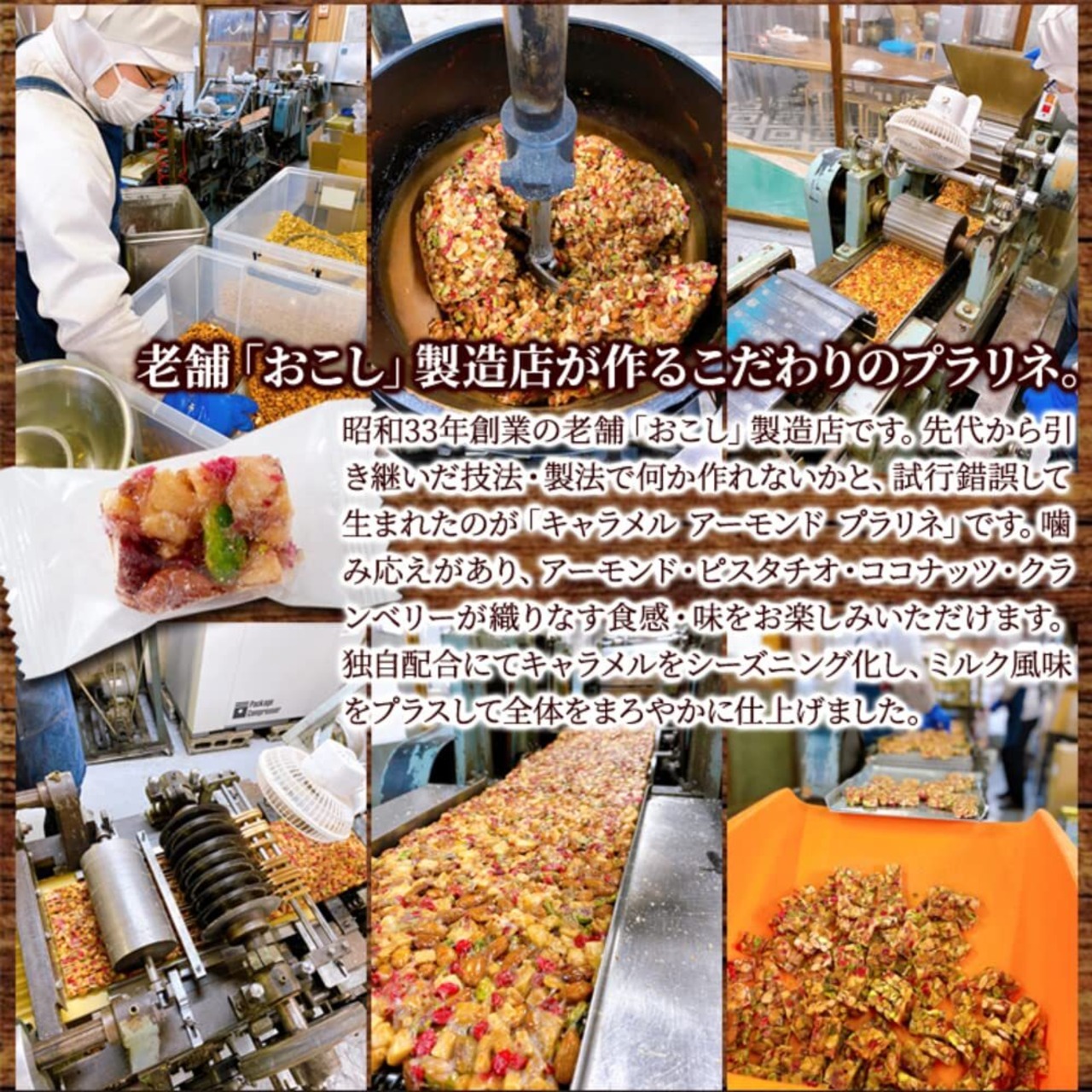 【至福のキャラメリゼ】昭和33年創業の老舗「おこし」製造店で、先代から引き継いだ「おこし」の技法・製法で何か作れないかと、アーモンドとピスタチオをベースに、風味豊かなココナッツと酸味が香るクランベリーをカラメル化(キャラメリゼ)しました。自然の恵みが贅沢に詰まった彩り豊かなプラリネです。