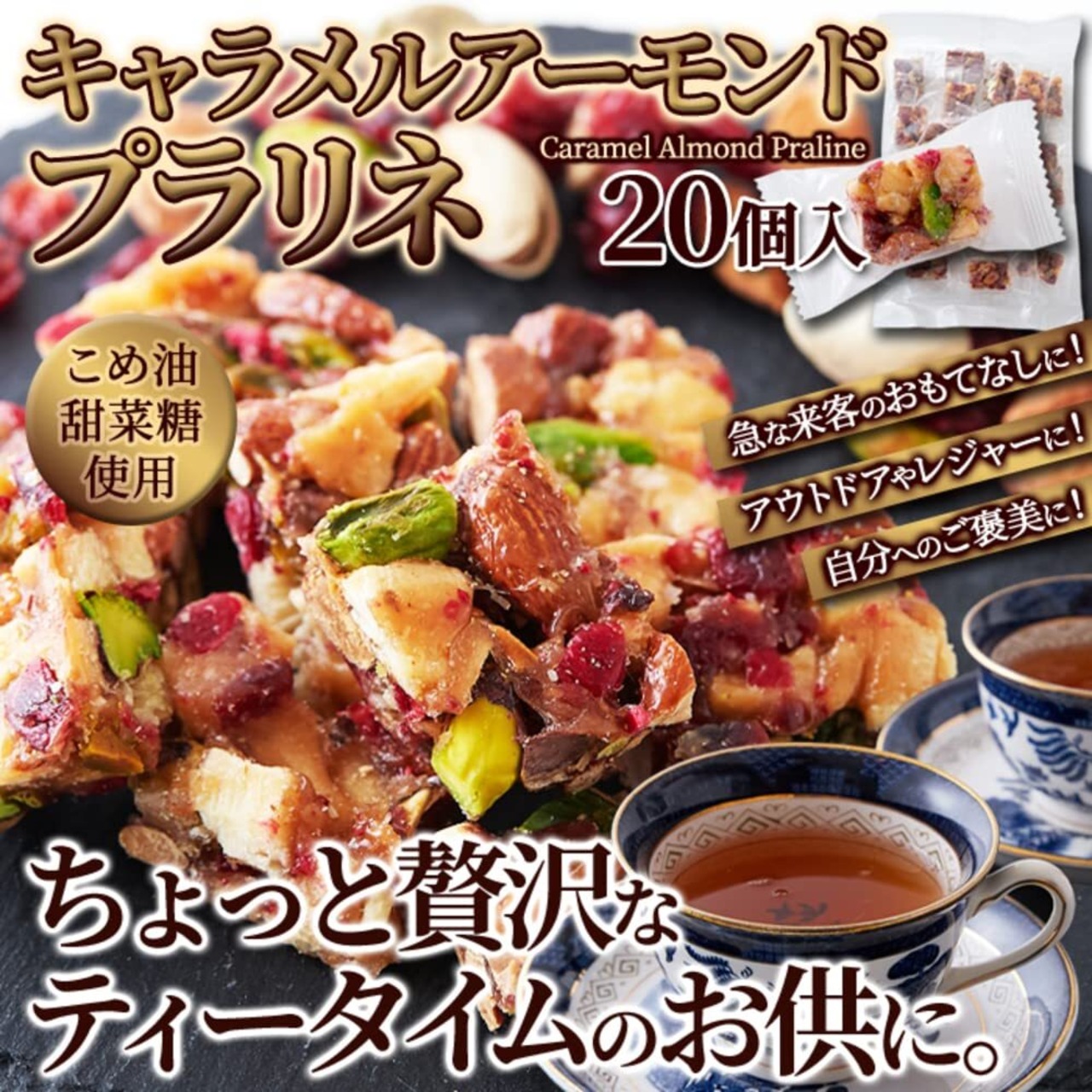 EBLIM キャラメルアーモンドプラリネ TVで話題 伝統的な「おこし」の製法 個包装 一口サイズ キャラメリゼ ナッツ ドライフルーツ アーモンド クランベリー ピスタチオ ココナッツ 国内製造 保存料 着色料 不使用 (20個)