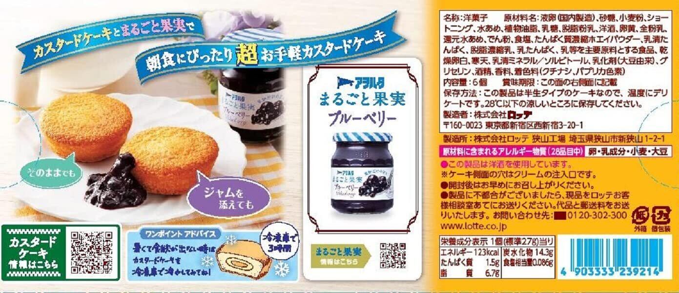 原材料: 液卵(国内製造)、砂糖、小麦粉、ショートニング、水あめ、植物油脂、乳糖、脱脂粉乳、洋酒、卵黄、全粉乳、還元水あめ、でん粉、食塩、たんぱく質濃縮ホエイパウダー、乳清たんぱく、脱脂濃縮乳、乳たんぱく、乳等を主要原料とする食品、乾燥卵白、寒天、乳清ミネラル/ソルビトール、乳化剤(大豆由来)、グリセリン、酒精、香料、着色料(クチナシ、パプリカ色素)