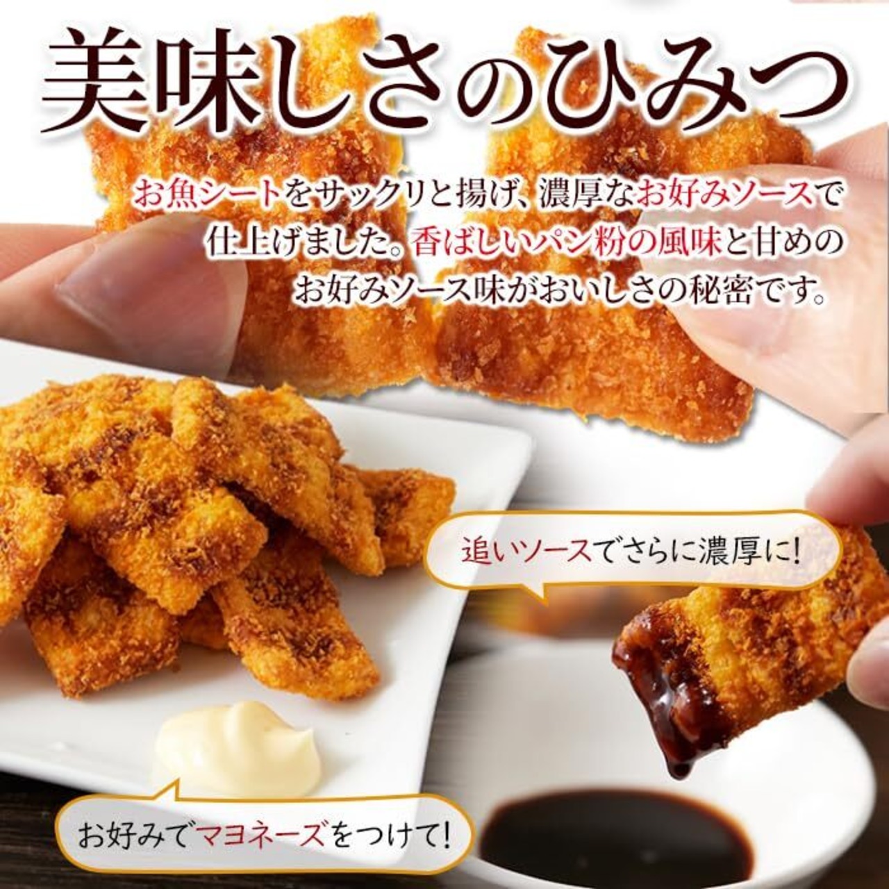 【美味しさのひみつ】お魚シートをサックリと揚げ、濃厚なお好みソースで仕上げました。香ばしいパン粉の風味と甘めのお好みソース味がおいしさの秘密です。