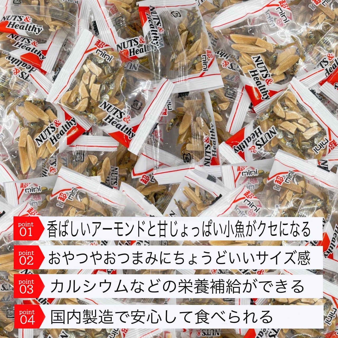 【栄養の魅力】︎カルシウム豊富: 小魚にはカルシウムがたっぷり含まれており、毎日の食生活をサポートします。︎ビタミンEと食物繊維: アーモンドにはビタミンEや食物繊維が含まれており、健康的な食生活をサポートします。