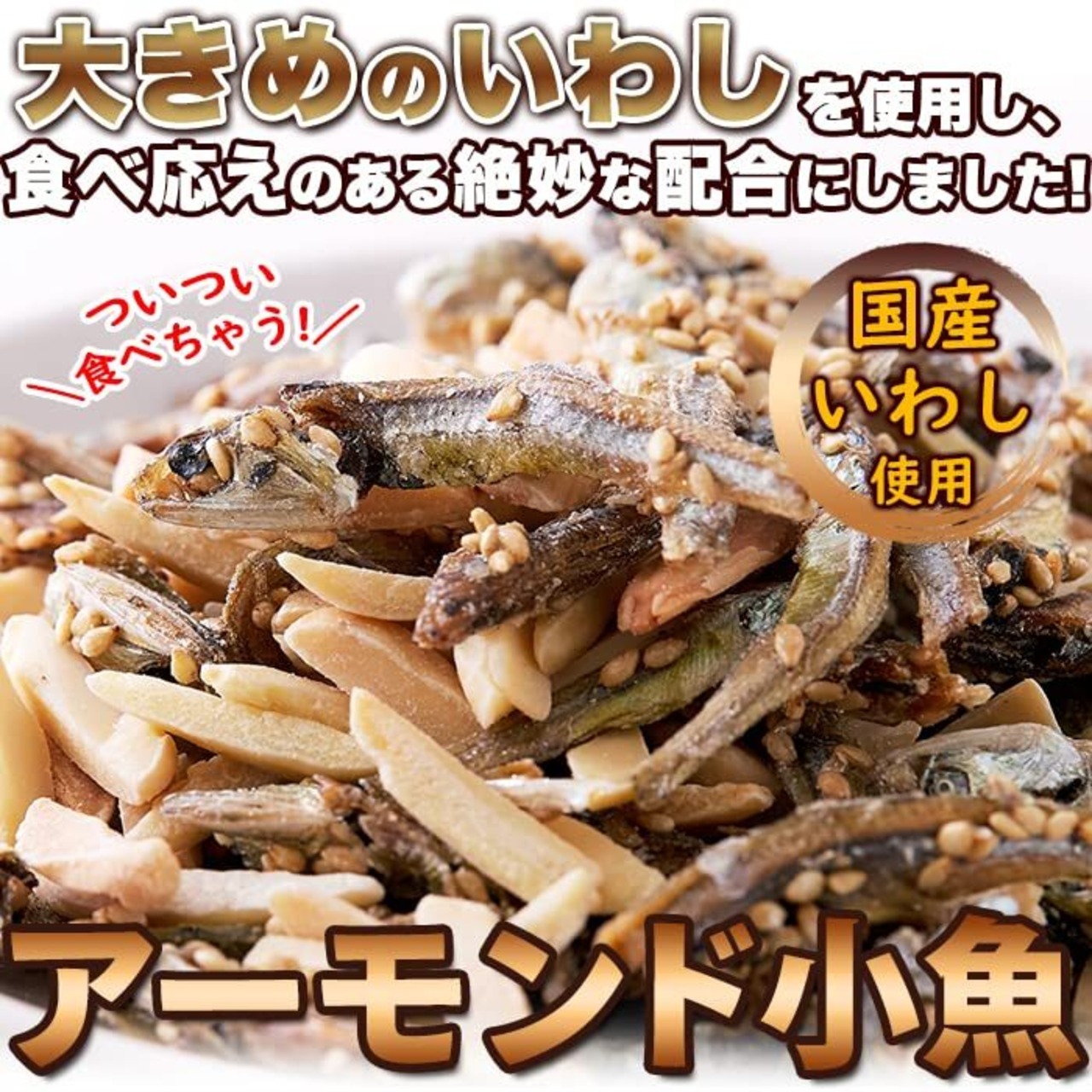 【食べ始めると止まらない!】食べ応えのある絶妙な配合!甘く味付けした大きめいわしにローストアーモンドをミックスしました。お子様のおやつやお茶請けに