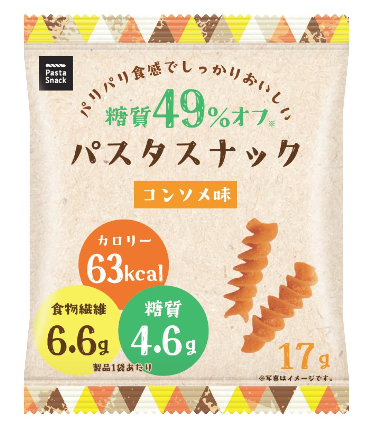 パリパリ食感でしっかりおいしい 糖質49%オフ(※) パスタスナック。1袋(17g) 食べても糖質4.6g、カロリー63kcal、食物繊維は6.6g (※)当社の一般的なパスタスナックと比べ、糖質を49%低減しています。