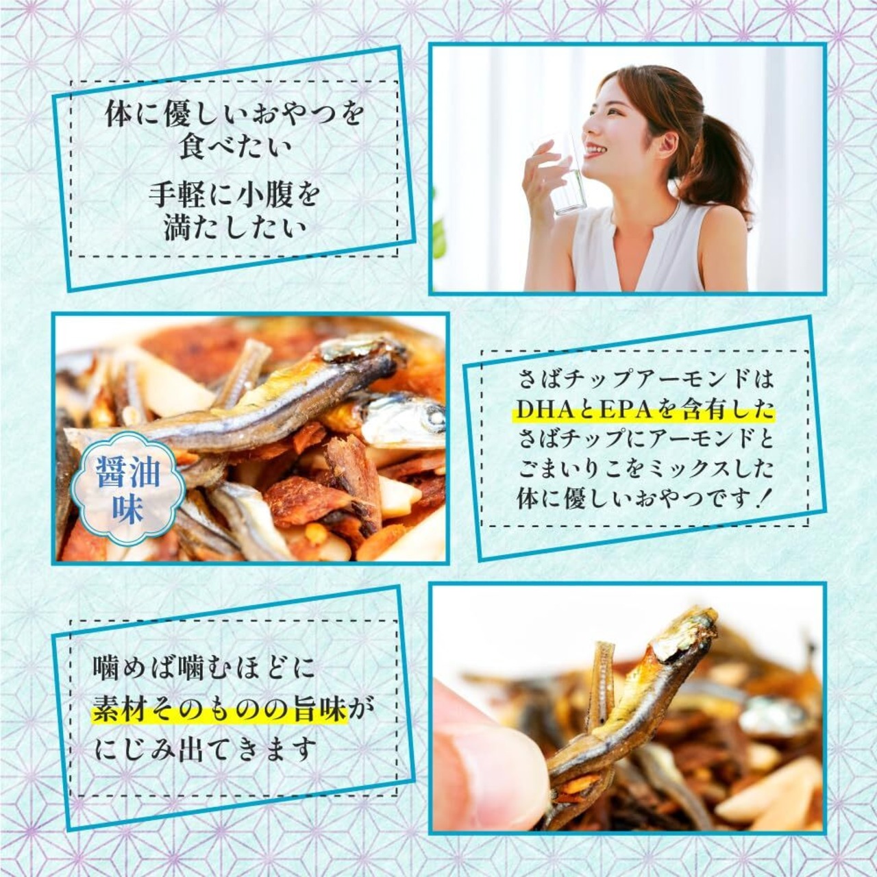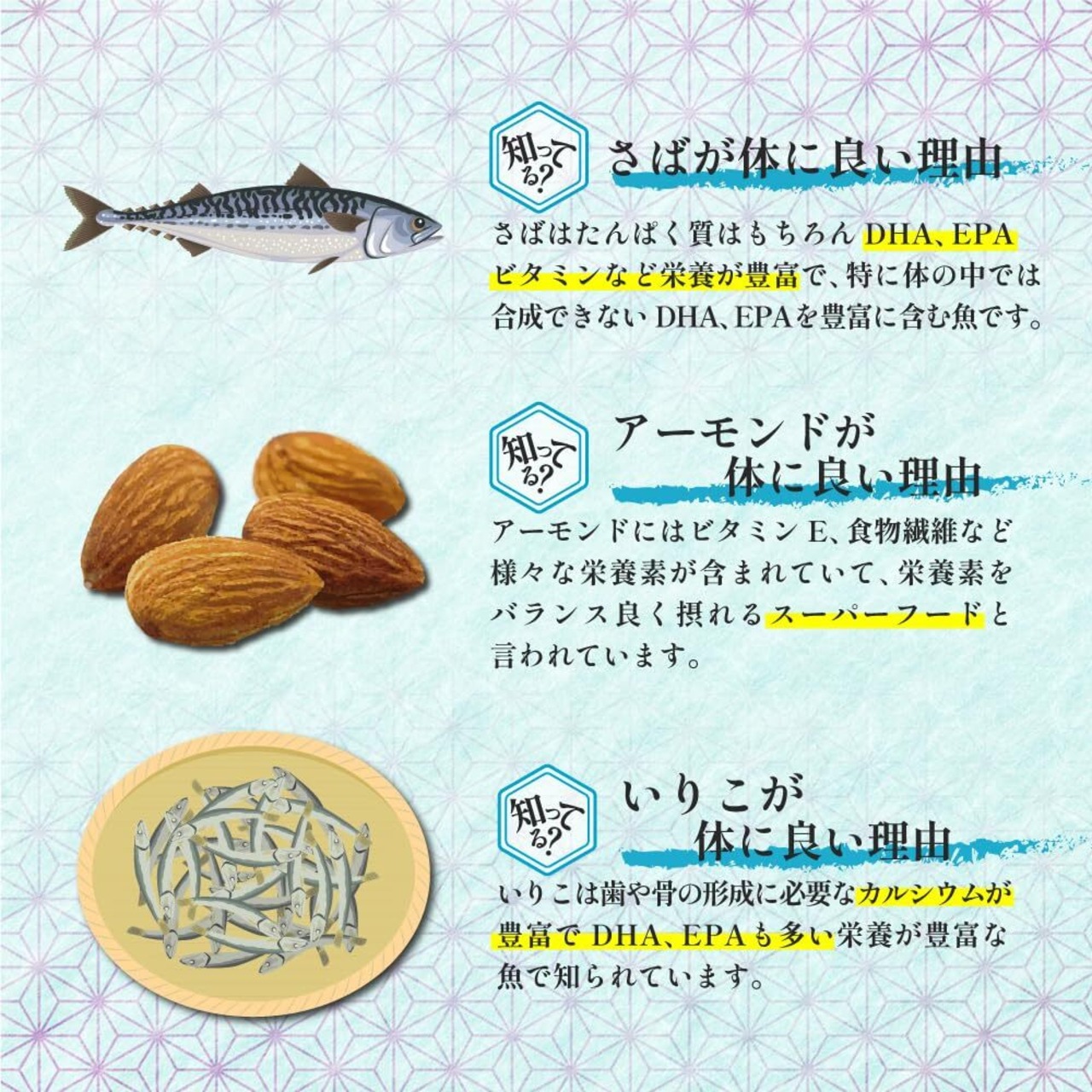 【原材料名】さばのふし(国内製造)、アーモンド、片口いわし、砂糖、醤油、水飴、ごま、発酵調味料、食塩、香辛料、酵母エキス/調味料(アミノ酸等)、酸味料、香料、(一部に小麦・アーモンド・ごま・さば・大豆を含む)