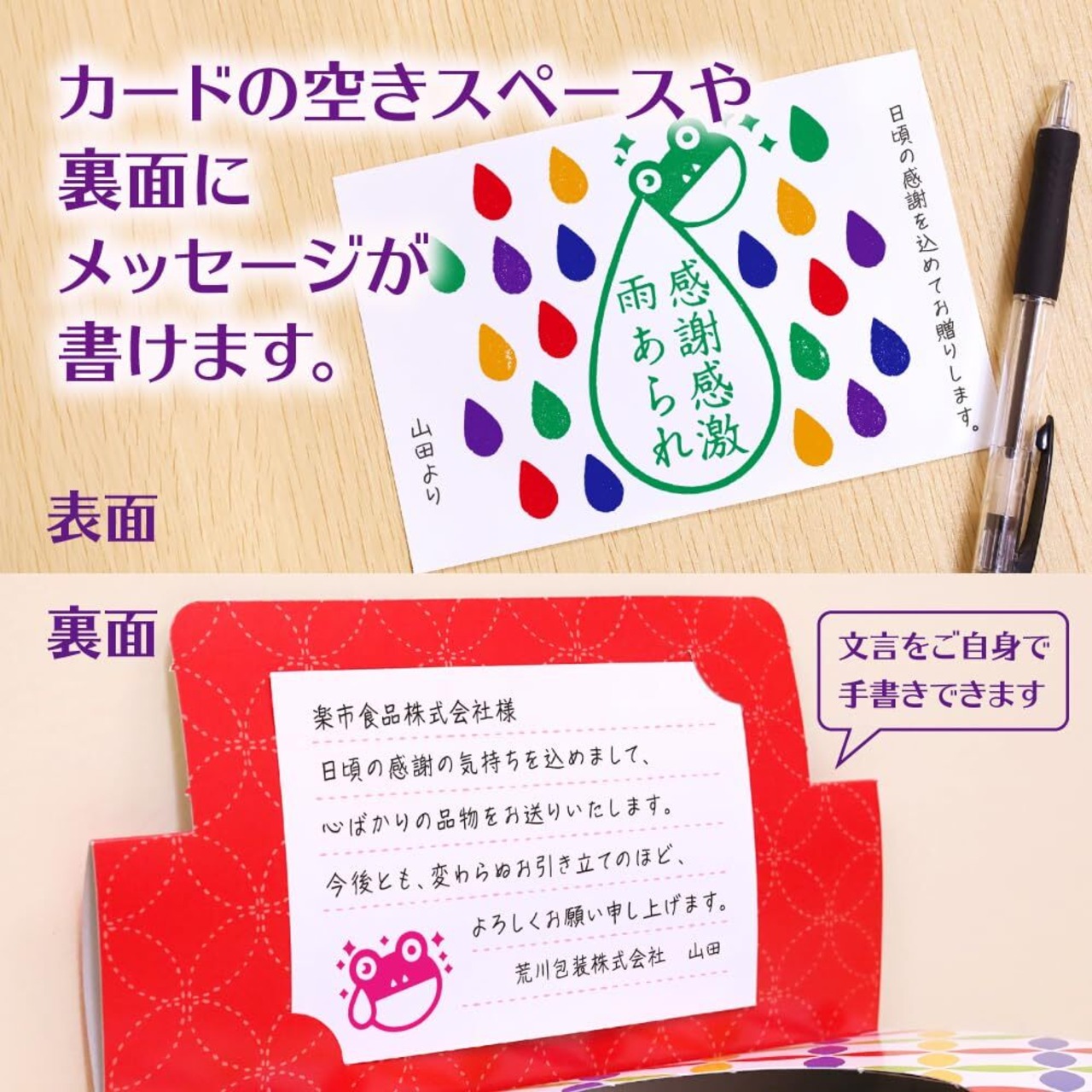 外箱にも「感謝感激雨あられ」のメッセージカードが差し込んであり、空きスペースや裏面にはメッセージなど手書きで記入できます。