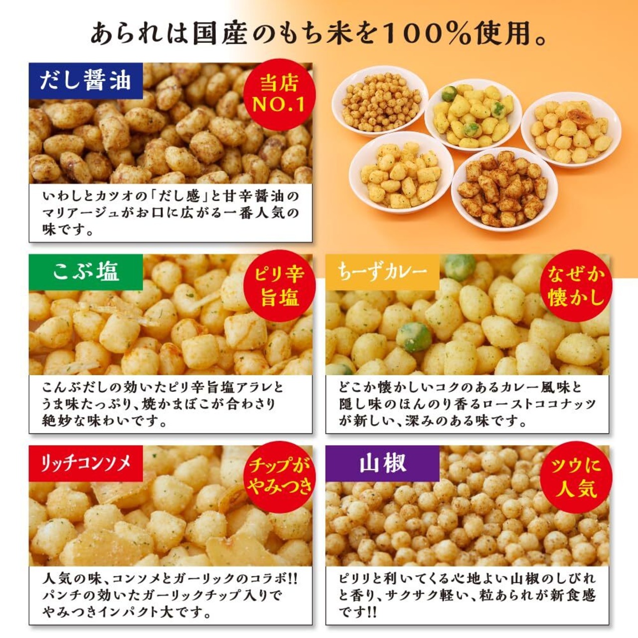 【だし醤油】もち米(国産)、粉末しょうゆ、植物油、鰹粉末、砂糖、いわし煮干し粉末/加工デンプン、酸化防止剤(ビタミンE)、(一部に小麦・大豆を含む) 【こぶ塩】もち米(国産)、植物油脂、魚肉加工品、昆布風味シーズニング、いか風味シーズニング、食塩、一味唐辛子、アオサのり/ソルビット、調味料(アミノ酸等)、加工デンプン、トレハロース、保存料(ソルビン酸)、pH調整剤、甘味料(ステビア)、(一部に小麦・大豆・いかを含む)