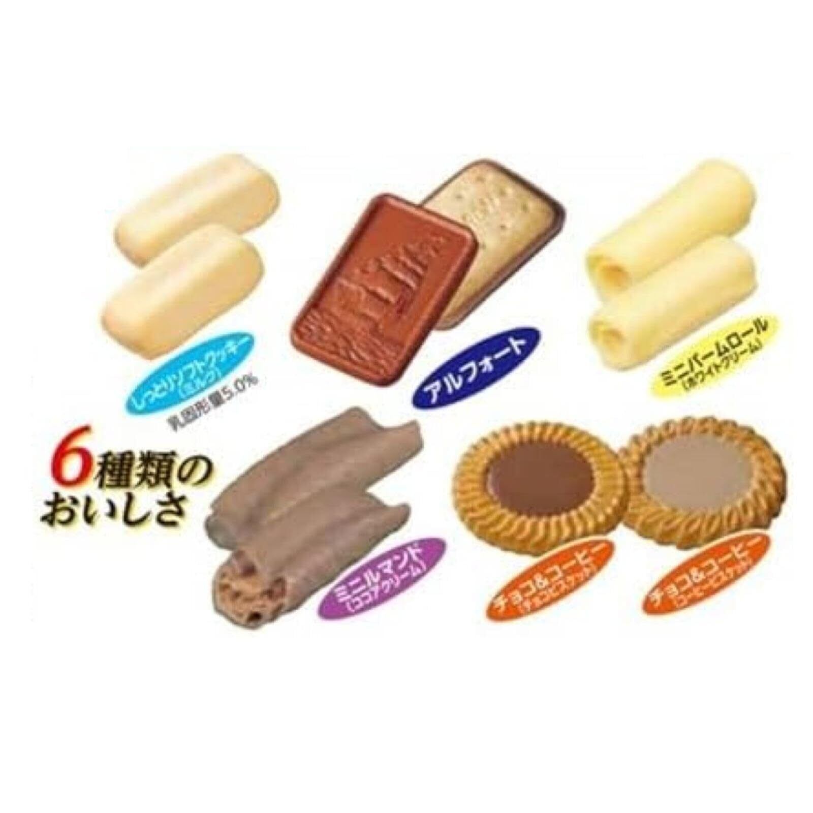 しっとりソフトクッキー(ミルク)、アルフォート、ミニバームロール(ホワイトクリーム)、ミニルマンド(ココアクリーム)、チョコ&コーヒー(チョコビスケット、コーヒービスケット)の6種類を詰合せました。