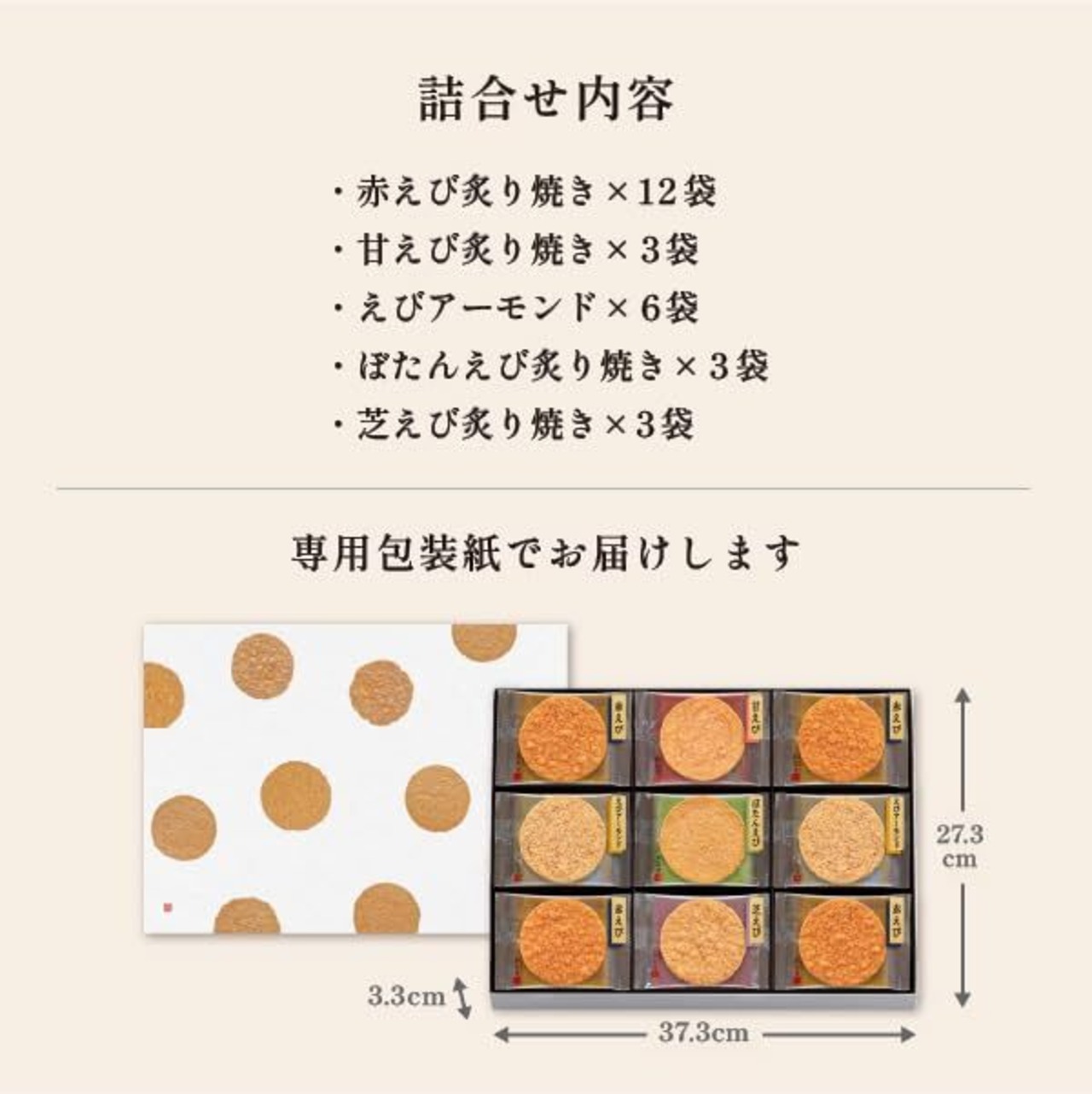27袋入(甘えび炙り焼き×3袋、ぼたんえび炙り焼き×3袋、芝えび炙り焼き×3袋、赤えび炙り焼き×12袋、えびアーモンド×6袋)