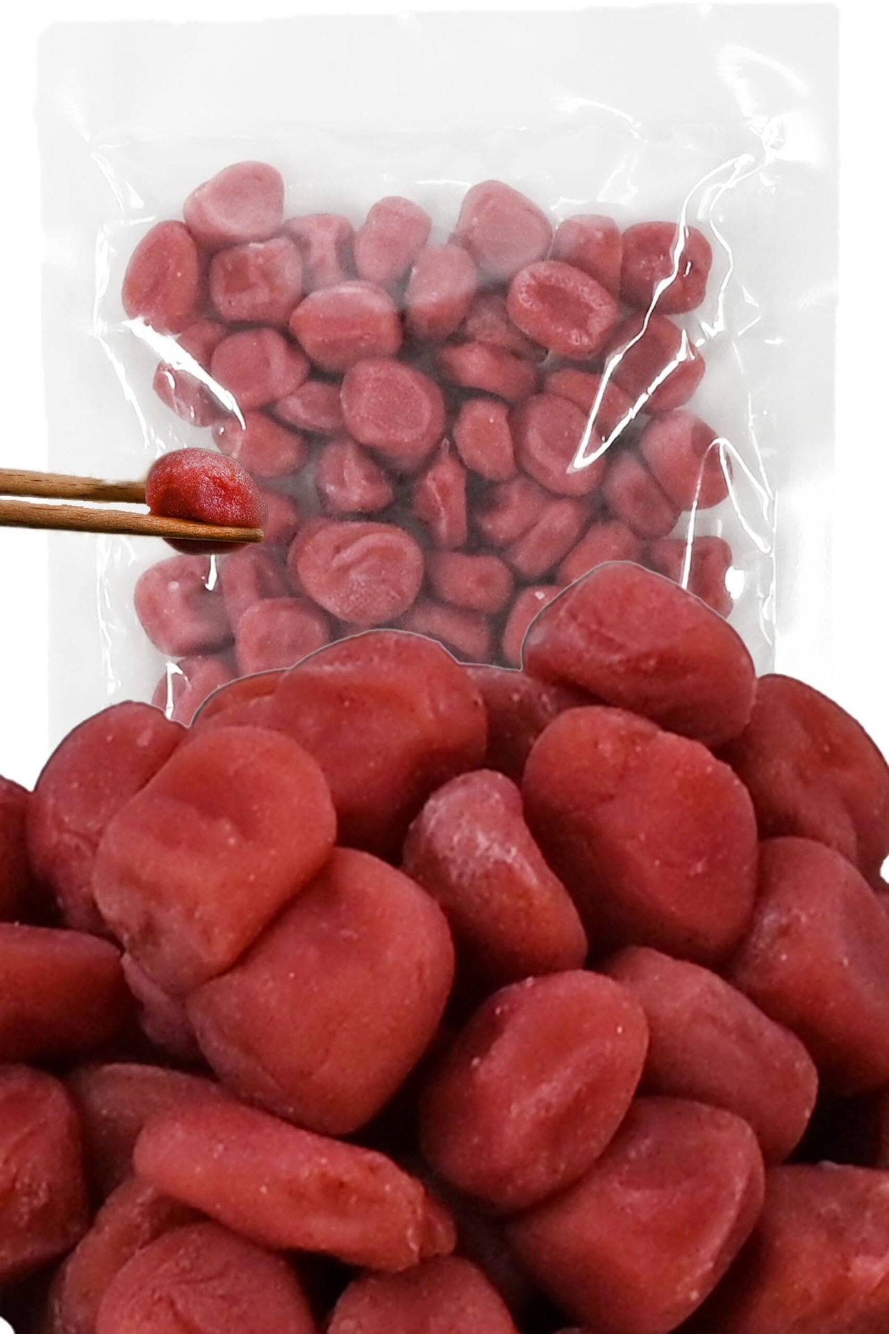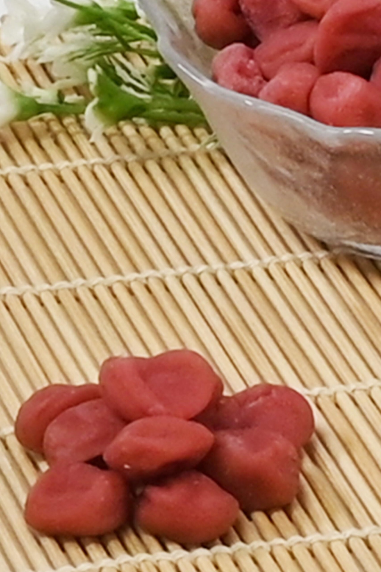 【原材料名】梅肉(梅(紀州産)、食塩)、りんごピューレ、澱粉分解物、しそ梅酢、でん粉、砂糖、食塩、醸造酢/粉末セルロース、調味料(アミノ酸)、酸味料、増粘剤(タンマリンドガム)、ゲル化剤(アルギニン酸Na)、甘味料(アスパルテーム・L・フェニルアラニン化合物)、塩化Ca、野菜色素、香料