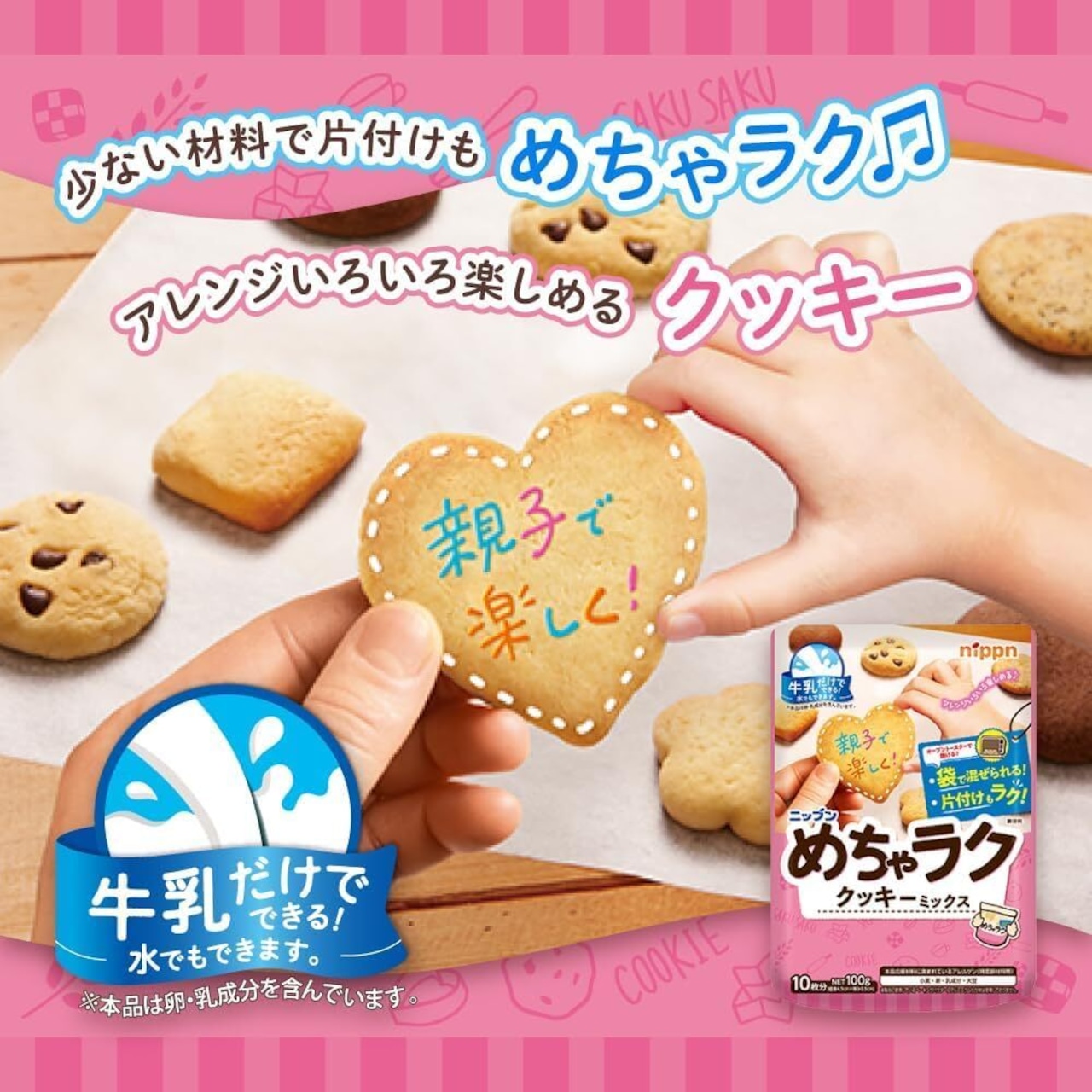 【おうちで簡単に楽しくお菓子づくり】ニップンの「めちゃラクシリーズ」は,①特別な材料がいらず準備が簡単,②難しくない簡単調理,➂袋の中でスプーン一本でまぜられるので片付けもラクラク, カンタンにお菓子を作ったら好きにアレンジをしてみんなで食べられる,おいしく楽しいお菓子作りを応援するデザートミックスです。