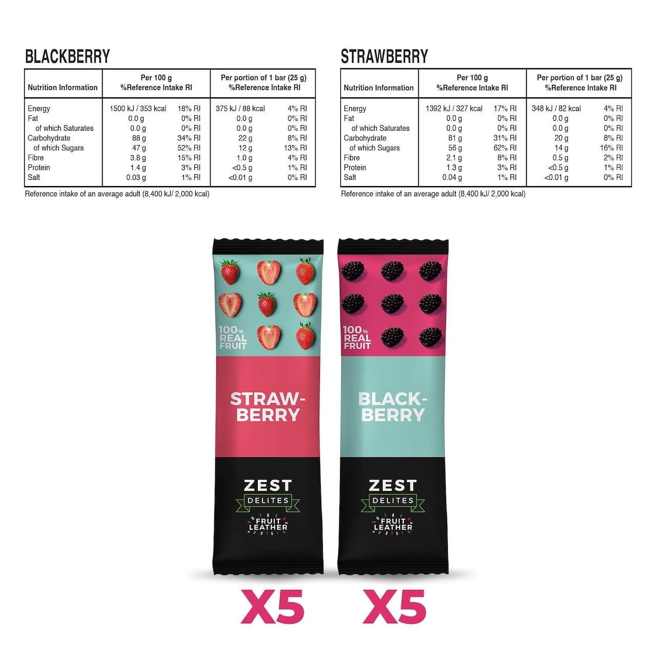 Zest Delites フルーツレザー、大人用のヘルシースナック、子供用シュガーフリースナック、フルーツロール、100%ナチュラル、それだけですべて、フルーツバーマルチパック、スナックボックス、ブラック&ストロベリー 0.88オンス x 10