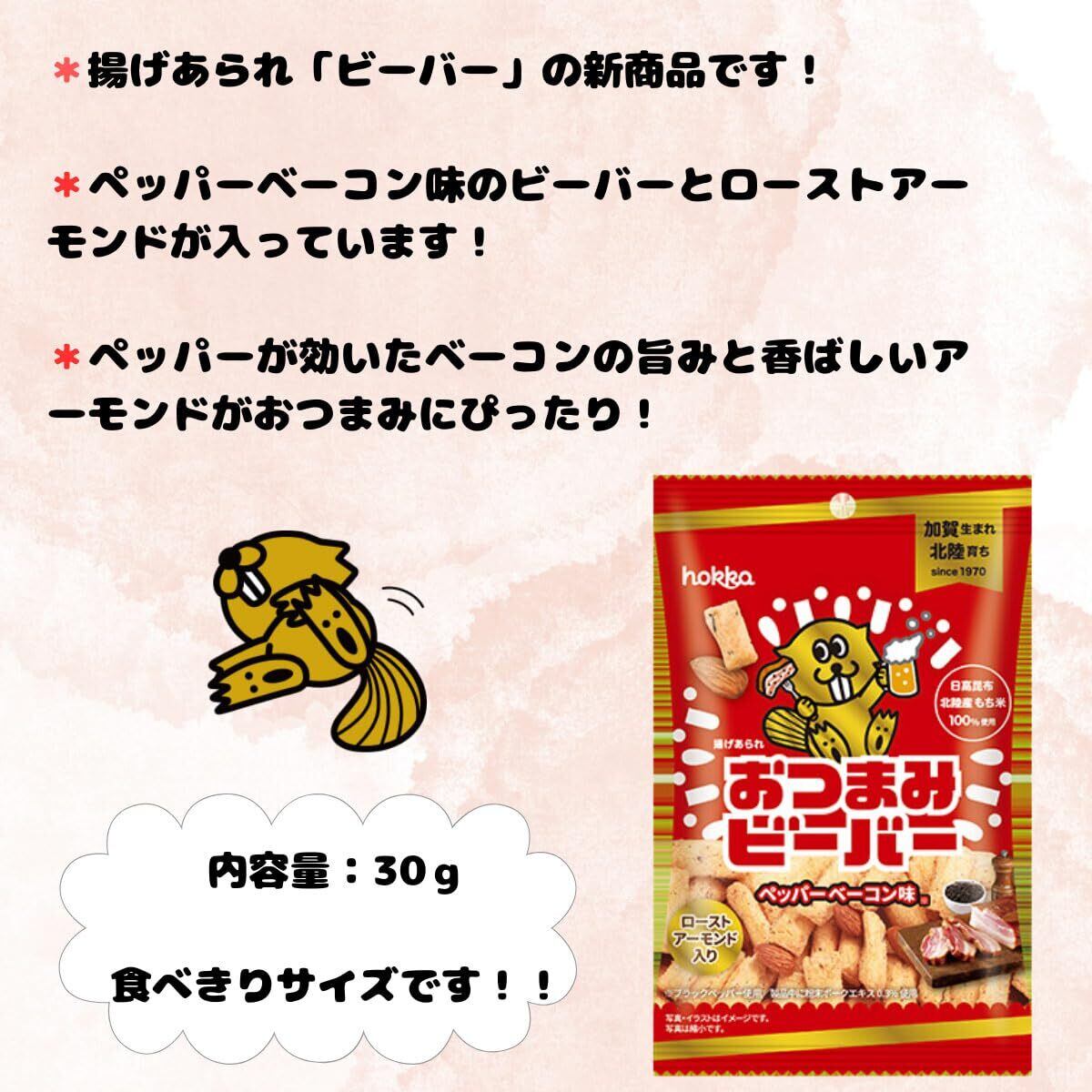 【おつまみビーバー】内容量:30g 原材料名:もち米(北陸産)、アーモンド加工品(国内製造)、植物油脂、ペッパーベーコンシーズニング(豚肉を含む)、昆布(日高昆布)/調味料(アミノ酸等)、香料(鶏肉由来)、香辛料抽出物、甘味料(ステビア) アレルギー表示:原材料に含まれるアレルギー物質(特定原材料等)アーモンド 豚肉 鶏肉 ●卵・乳成分・小麦・えび・かに・くるみを含む製品と共通の設備で製造しています。
