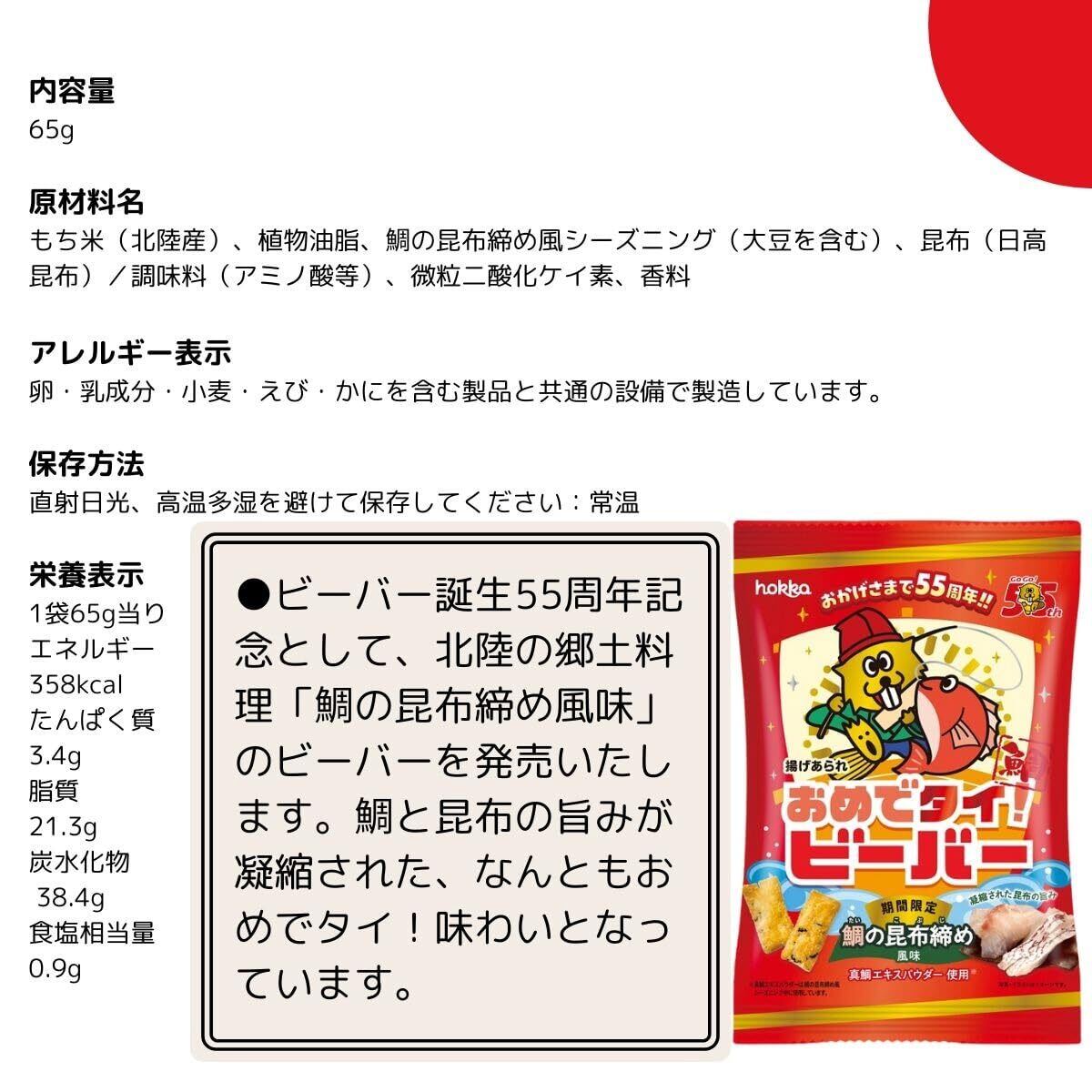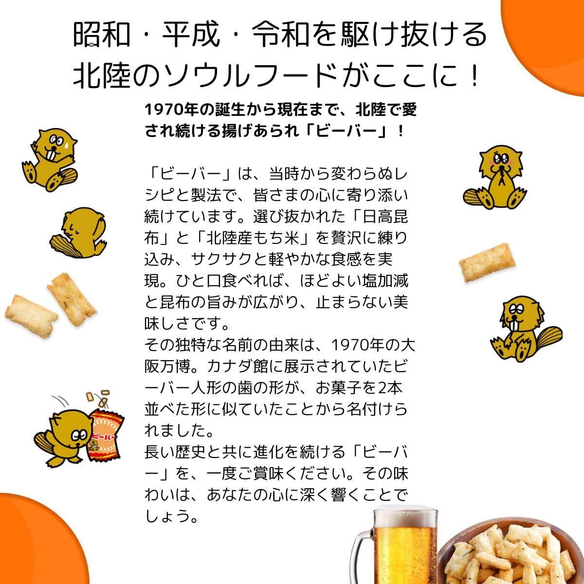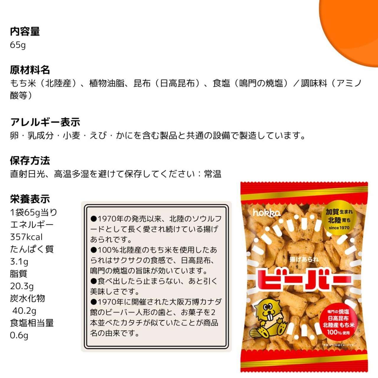 【ビーバー】内容量:65g 原材料名:もち米(北陸産)、植物油脂、昆布(日高昆布)、食塩(鳴門の焼塩)/調味料(アミノ酸等) アレルギー表示:卵・乳成分・小麦・えび・かにを含む製品と共通の設備で製造しています。