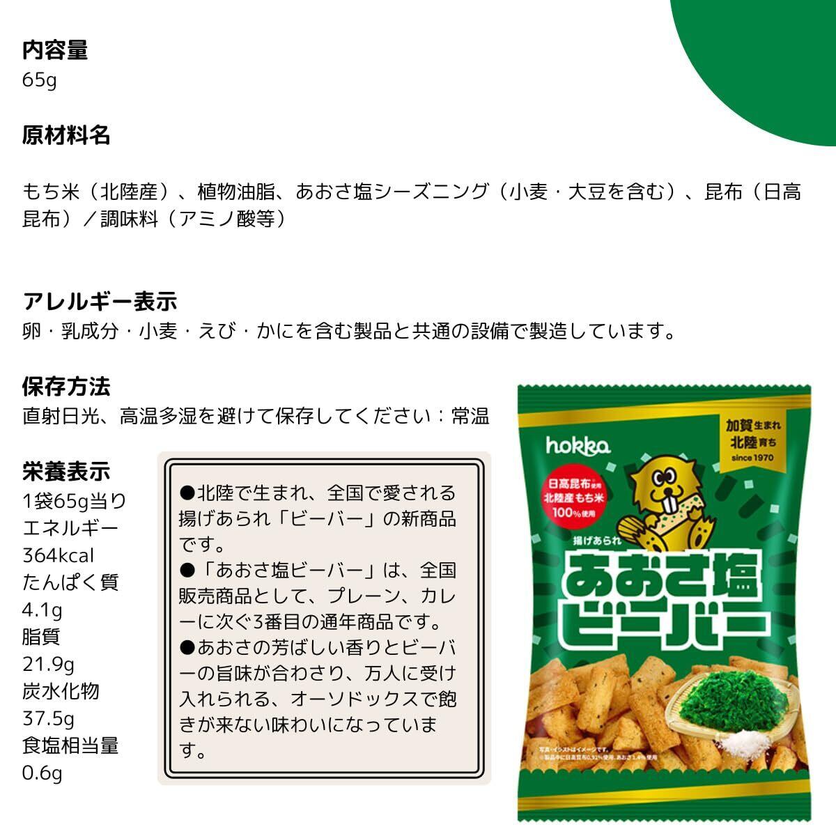 【あおさ塩ビーバー】内容量:65g 原材料名:もち米(北陸産)、植物油脂、あおさ塩シーズニング(小麦・大豆を含む)、昆布(日高昆布)/調味料(アミノ酸等) アレルギー表示:原材料に含まれるアレルギー物質(特定原材料等)小麦・大豆 卵・乳成分・えび・かにを含む製品と共通の設備で製造しています。