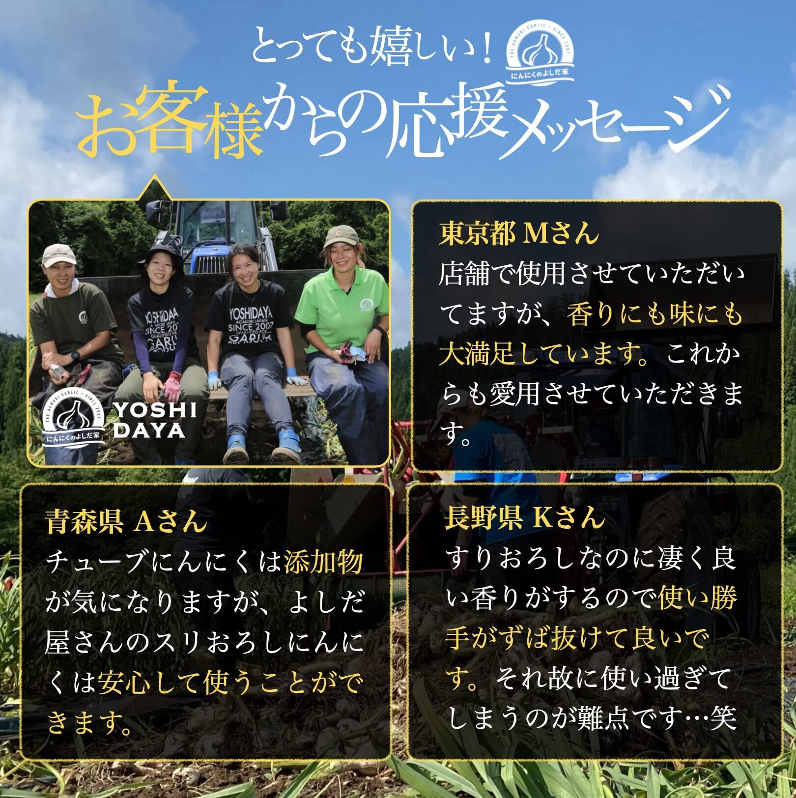 【にんにくのよしだ家とは】農業生産法人株式会社よしだやは、全国的にも有名なにんにくの産地である青森県でにんにくを栽培しています。 よしだやの使命はにんにく本来の味・そして栄養価の高いにんにくの持つ力を最大限に引き出すこと。 美味しくて栄養価の高いにんにくを全国のみなさんに届けたい、そしてたくさんの人を笑顔にしたい。それが私たちの想いです。