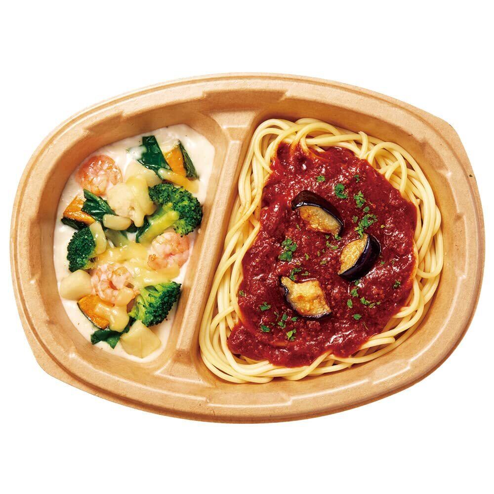 海老と5種の野菜が入った具沢山のクリーミーグラタンと牛挽肉を使用したボロネーゼのスパゲッティのセット。