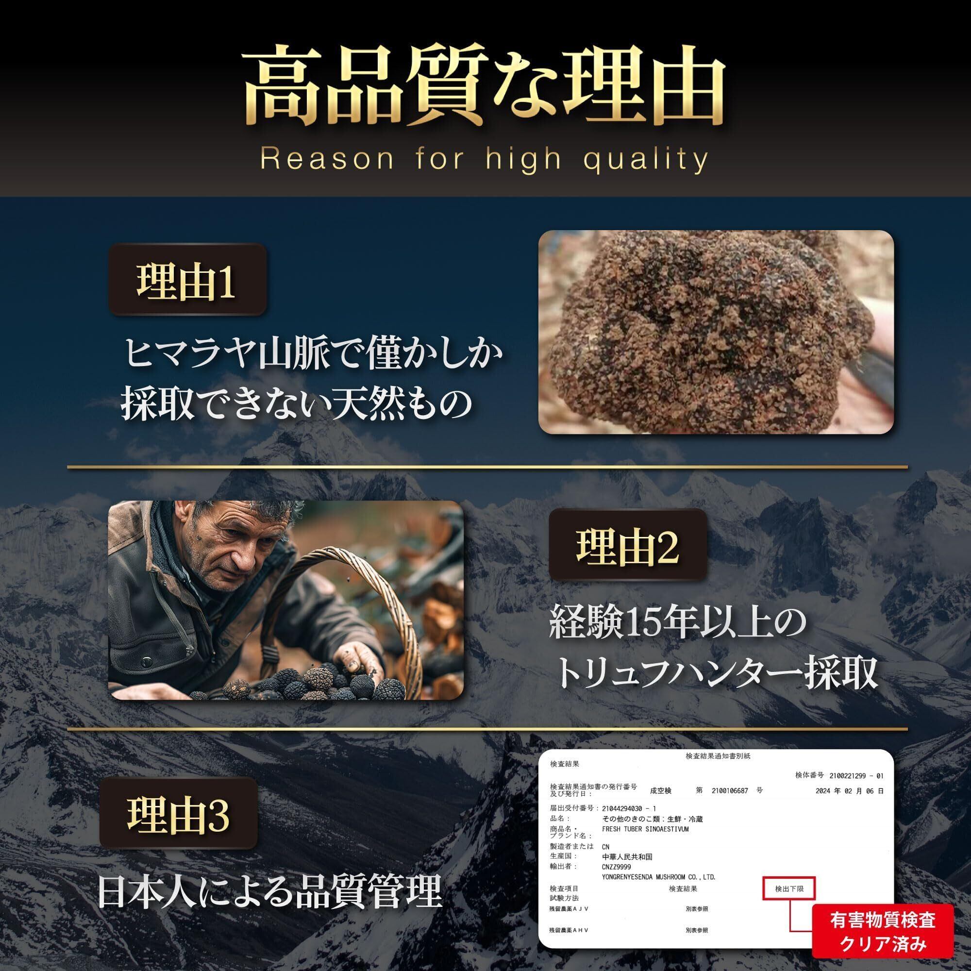 ️【高品質の証明】 この黒トリュフは、中国のヒマラヤ山脈の標高3,000メートルで収穫される希少な天然トリュフです。採取は15年以上の経験を持つトリュフハンターが行い、品質の高さをします。