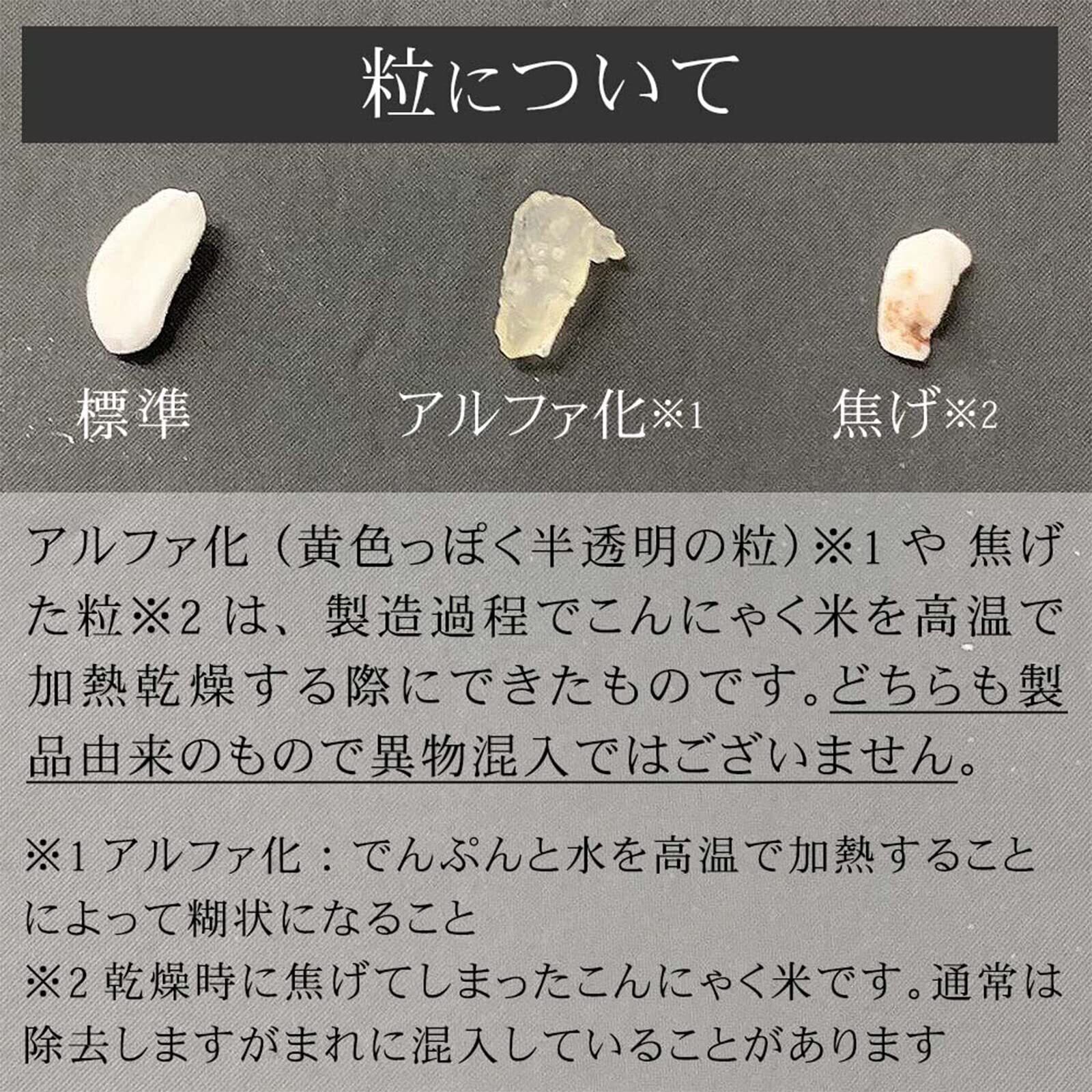 「黄色っぽく半透明の粒、焦げた粒について」 製造過程で、こんにゃく米を高温で加熱乾燥する際にできたものです。どちらも製品由来のものであり異物混入ではございません。