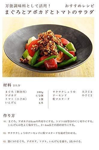 なたね油(国内製造)、ローストアーモンド、フリーズドライしょうゆ(小麦、大豆を含む)、フライドオニオン(小麦を含む)、砂糖、食塩、ごま油、フライドガーリック、酵母エキス、ごま、しょうゆ、魚醤パウダー、こしょう/加工でん粉、酸化防止剤(ビタミンE)