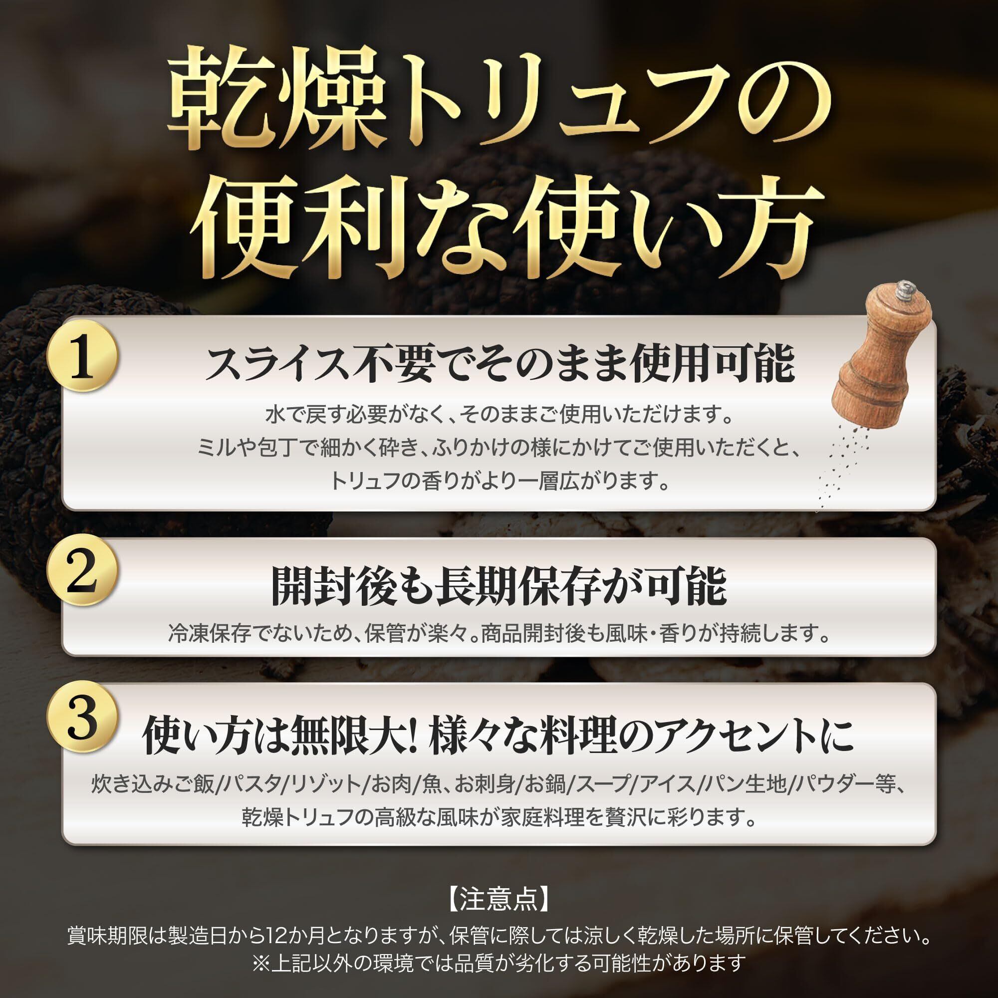 ️【保存方法】 乾燥トリュフは涼しく乾燥した場所に保管するだけで、長期間にわたって新鮮な風味を保ちます。冷凍保存の必要がなく、取り扱いが非常に楽です。